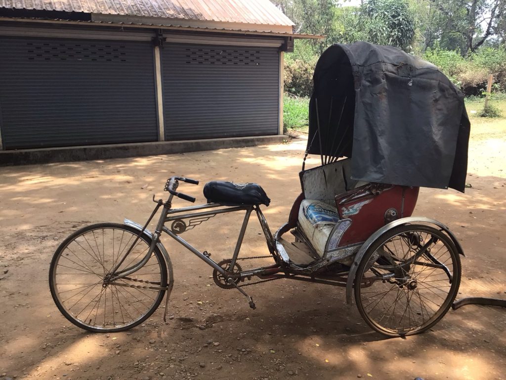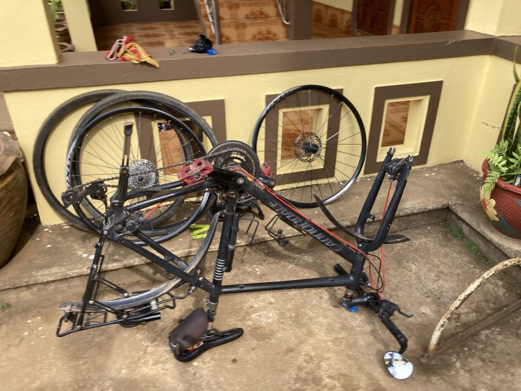 Plus sérieusement, je retrouve mon Haka2, sorti de la maison d’à côté où il a passé la nuit, avec le pneu arrière à plat. Pourtant, hier, j’ai roulé après être sorti de chez le vélociste qui m’avait regonflé les pneus à bloc. Cela commence fort. Je démonte la roue. Je sors la chambre à air. Le réceptionniste m’apporte une bassine d’eau pour que je puisse détecter le trou d’une crevaison lente. Las ! Aucune bulle. Je remonte une chambre à air neuve et verrai cela plus tard. Entre-temps, j’ai demandé au réceptionniste qu’il se renseigne sur le prix d’un taxi pour m’amener au temple de Wat Phou. Cela me coûterait 3 nuits d’hôtel. Je laisse tomber l’idée. A 6h30, je pars enfin.