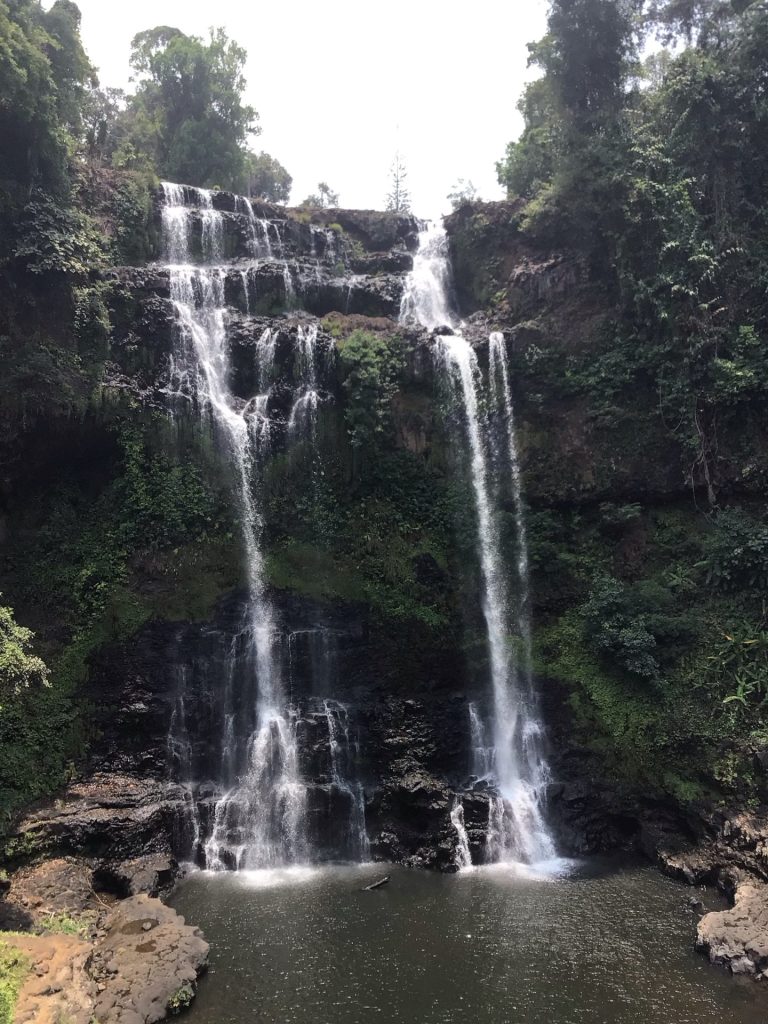 Peu avant midi, j’arrive aux chutes de Tad Yuang. L’entrée est payante (1€ pour les touristes) mais il n’y a pas vraiment foule. Je croise seulement 2 couples de touristes anglophones. Les minorités Alak et Katu vivent dans ces forêts primaires et, maintenant, le long de la route. La photo avec quelques femmes de ce village est incontournable. Elles prennent la pose moyennant quelques kips. La mamie de gauche est particulièrement facétieuse avec ses lunettes rouges et sa pipe en bambou.