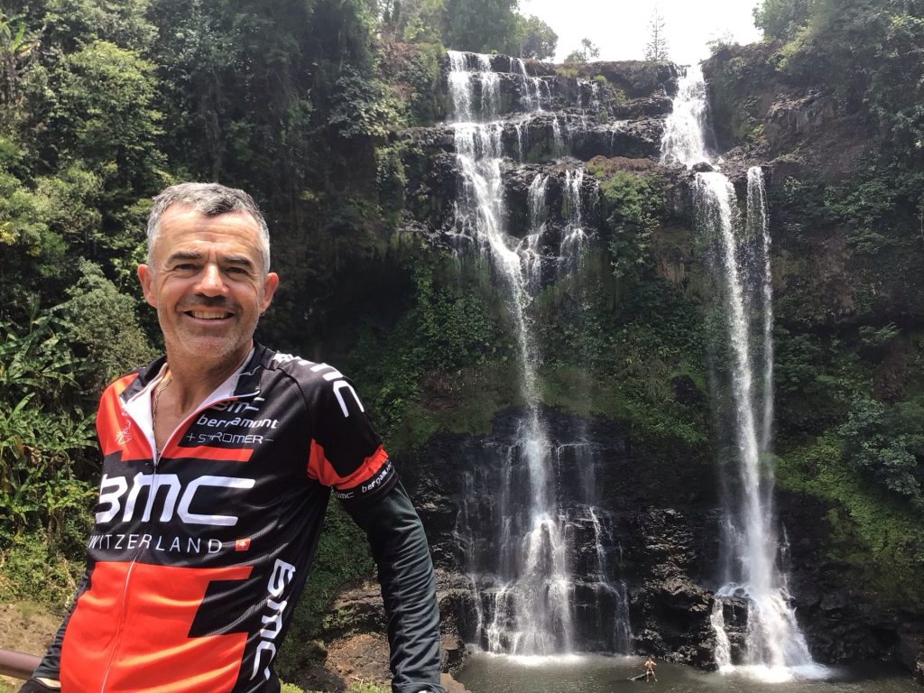 Une fois arrivé au pied de ces chutes, je ne garde que le cuissard pour aller faire un plouf. La température de ‘l’eau est beaucoup plus fraiche que celle du Mékong. Une fois remonté dans le village commerçant, un vieux monsieur laotien m’interpelle : « Vous êtes français vous ? ». Pourtant, je porte une marque suisse. J’entame la conversation … avec Inpong le propriétaire de ce site. Cet homme de 79 ans en pleine forme a appris le français à l’école au Laos. Puis il est parti en France et a passé son bac en 1963 à Montpellier. Il a ensuite vécu très longtemps dans le centre de la France. D’ailleurs, il est connu sous le nom du « Berrichon du Mékong » (Le berrichon du Mékong). Encore un sacré personnage ! Je parcours les 800 mètres du chemin qui me ramène sur la route. La météo se gâte à l’ouest. De gros nuages noirs s’accumulent sur le sommet du Phou Chun Tuar à 1250 mètres d’altitude.