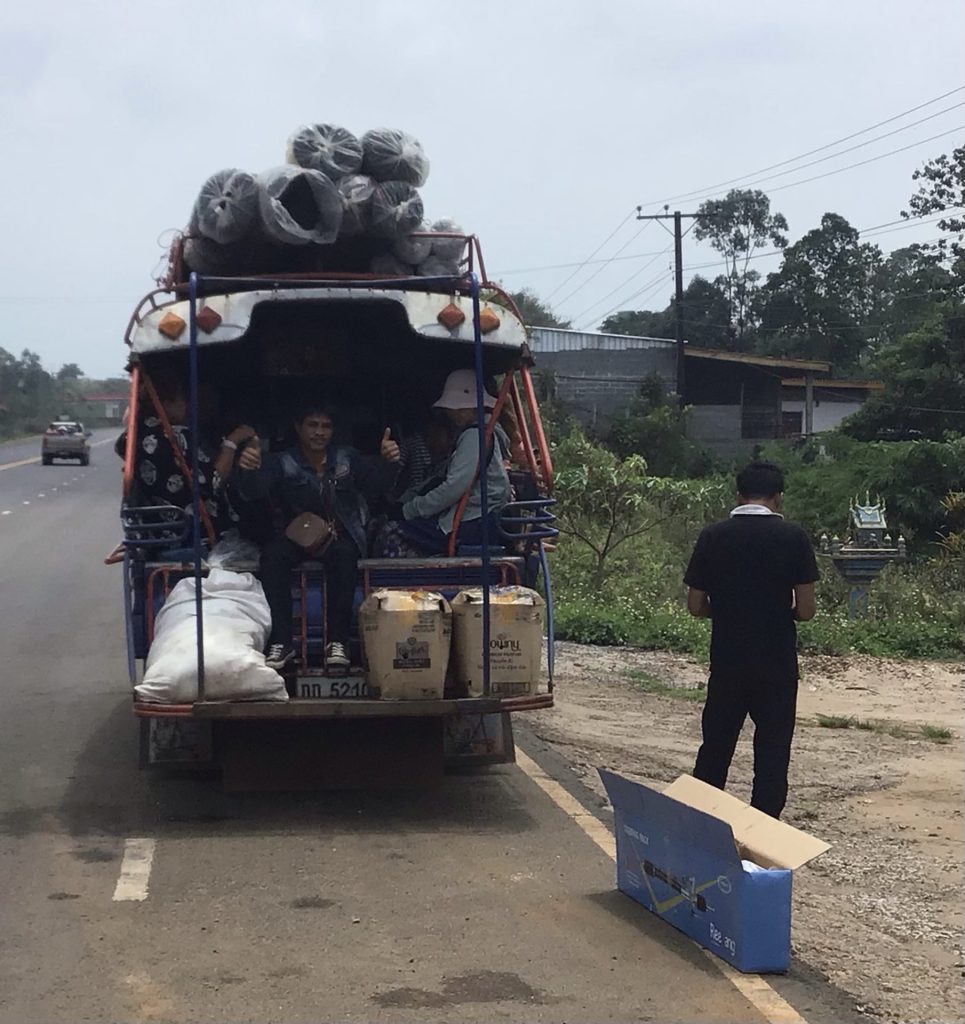 Je circule toujours sur ma bande bien à droite des 2 voies. Le trafic n’est pas intense mais je préfère me tenir à l’écart d’un éventuel fou furieux. Cependant, des obstacles m’obligent parfois à emprunter la voie de droite. Ici, c’est un des nombreux bus locaux qui s’est arrêté pour charger un nouveau passager. Ces petits bus n’ont pas de vitres. Les autochtones s’entassent là-dedans et calent leur chargement comme ils peuvent.