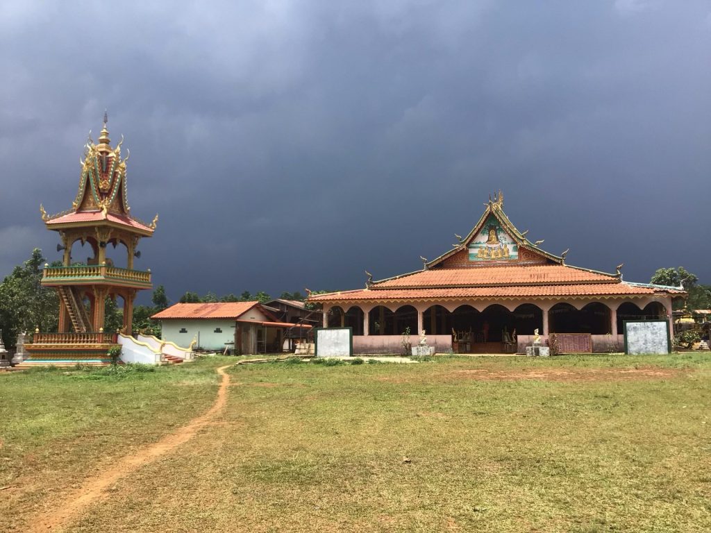 Le vent vient du nord-est et le ciel est plutôt bleu de ce côté-là. Je pense que ça devrait tenir. Il ne me reste plus qu’une dizaine de kms vu que je viens de passer devant le village du km 40. C’est étonnant cette appellation. Les nuages sont encore un peu plus impressionnant devant ce temple. Je n’aimerais pas être en montagne sous les orages qui éclatent au loin.