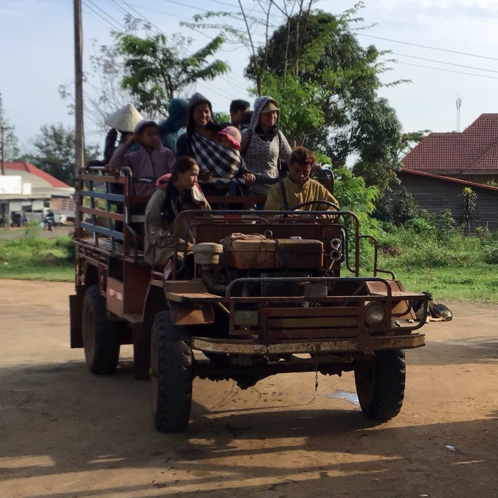 Je traverse de nombreux hameaux et villages. Les paysans partent au champ. Beaucoup empruntent cette espèce de jeep bruyante et crachotante de la fumée noire. D’autres sont tassés dans une remorque tirée par ces gros motoculteurs fort utilisés également au Cambodge. Les plus riches y vont en scooter.