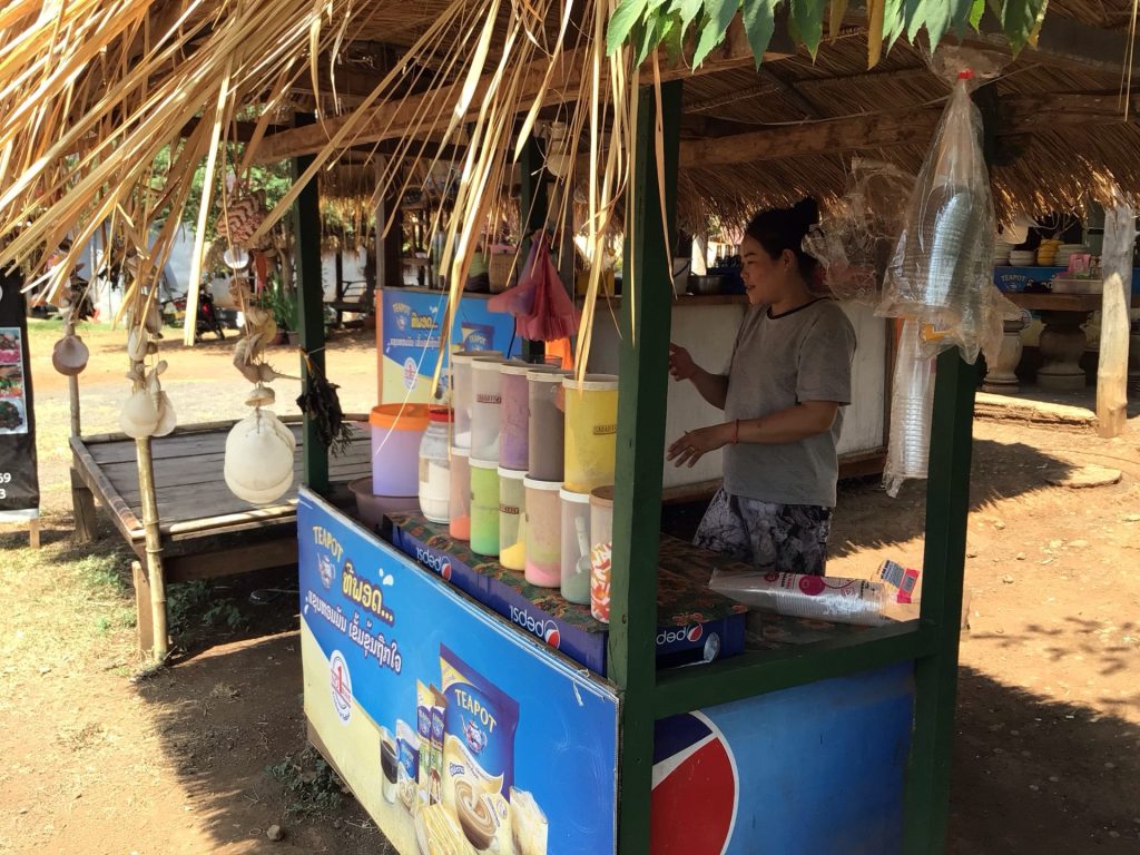 A la sortie de ce village de Dongko-Kang, je m’arrête à un stand boisson. Comme il n’y a pas de café, je vais tester une de ces boissons colorées et glacées que beaucoup boivent tout au long de la journée. Je vais devoir choisir au pif. J’en vois une avec de la poudre blanche. Je demande « Coco ? ». La jeune femme acquiesce. Je m’installe sur une petite table à l’ombre d’une tonnelle en osier. Ma boisson arrive. Elle est marron. Bizarre pour de la noix de coco. En fait, c’est du chocolat. J’adore le chocolat. Donc ça ira. Par contre, celui-ci est mixé avec du lait en boîte auquel sont ajoutés des morceaux gélatineux et de la glace pilée. C’est bon. Mais mon estomac, pourtant robuste, ne va pas trop apprécier.