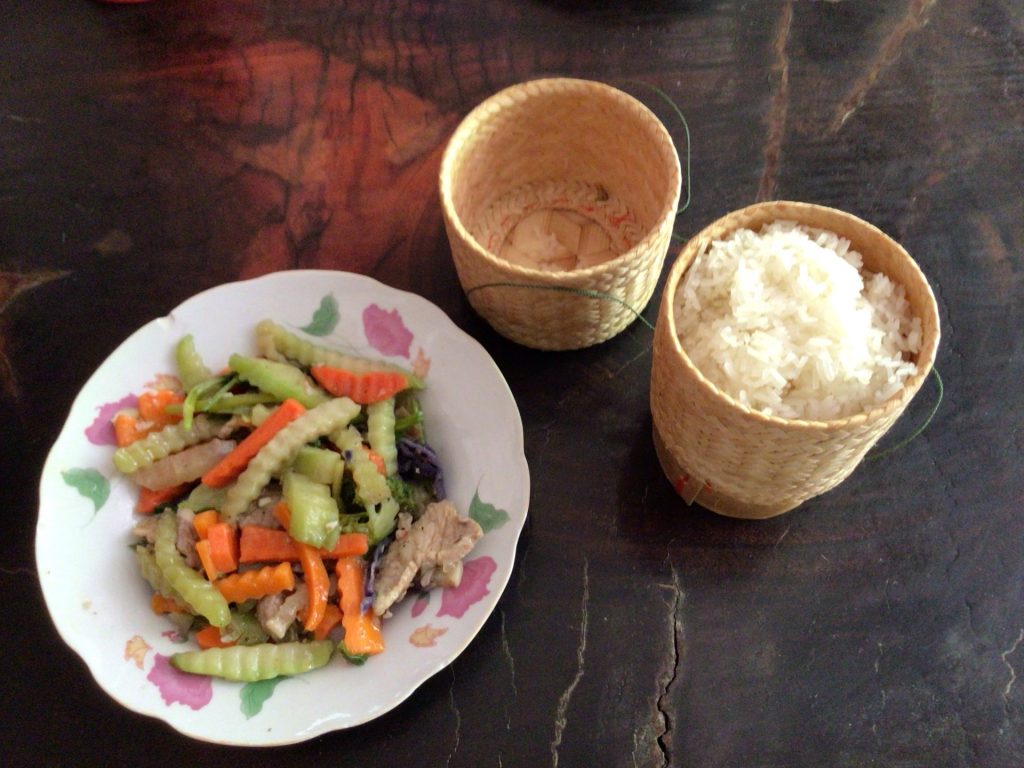 J’ai juste le temps de récupérer mes clés et de filer fissa aux toilettes. Cela va bientôt faire 150 jours que je suis en Asie et c’est la première fois que je me chope la courante … à cause d’un chocolat. Incroyable ! Dans ma pharmacie d’urgence, j’ai pensé à prendre de l’Imodium. Cela devrait faire l’affaire. Puis je pars à la recherche d’un restau où ils servent du riz. Je trouve mon bonheur pas très loin. De plus, le riz est servi dans ces récipients en osier que beaucoup emporte en bandoulière pour déjeuner le midi. Une assiette de légumes cuits à la vapeur accompagnera le riz. Ce sera parfait pour mon estomac patraque et en vrac.