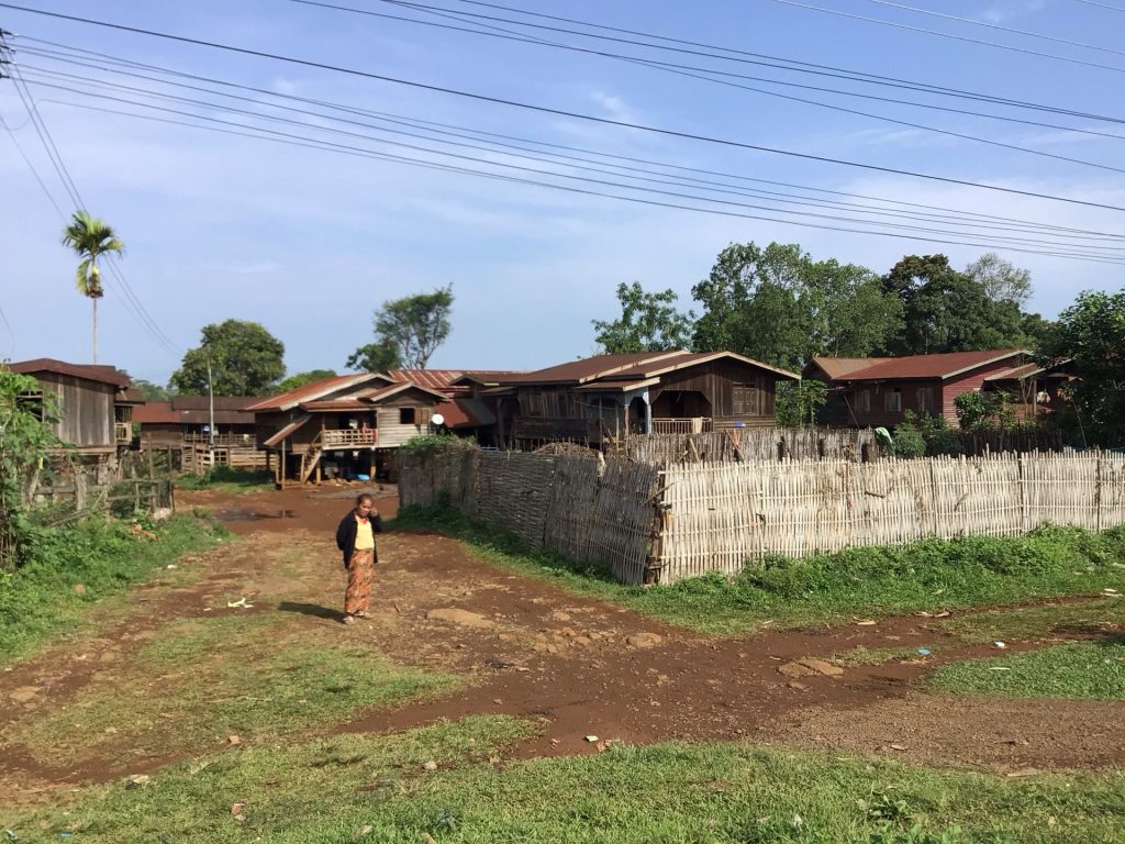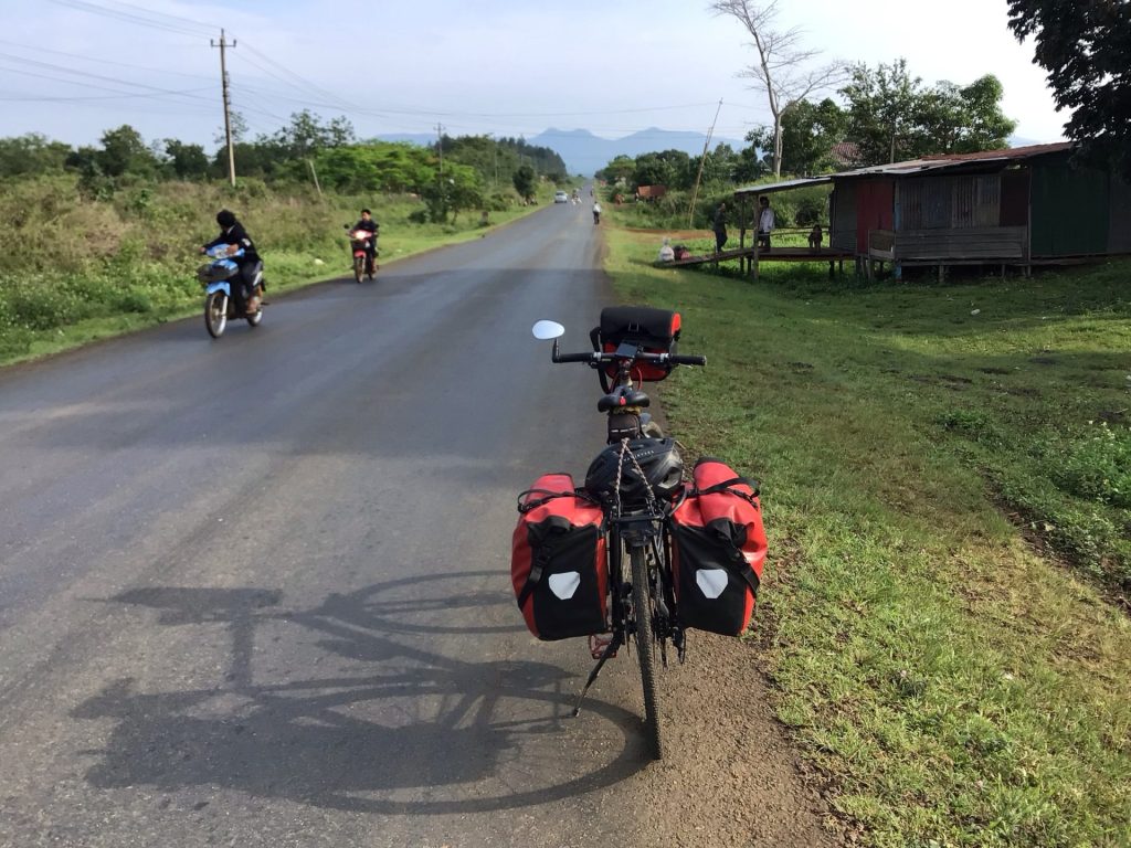Avant de prendre la route, il me faut retirer de l’argent. En effet, mes nombreuses dépenses à Lakse ont pompé dans mes billets de 100.000LAK. Et, dans ces endroits non touristiques, la CB n’est accepté nulle part. J’essaie dans 3 distributeurs avant d’en trouver un qui accepte la carte VISA. Ensuite, je trouve une gargote en train d’ouvrir. Je commande du riz et une brochette. Le riz m’est apporté blanc sans sauce. A 6h00, j’attaque la traversée du Plateau des Bolovens. Je quitte ce grand boulevard urbain qui scinde cette ville toute en longueur. Le soleil se lève à peine