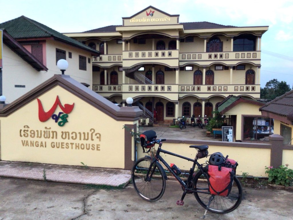 Et puis, je ne me vois pas continuer la route sous cette chaleur suffocante avec le bide en vrac. Je m’arrête à l’ombre pour repérer un hébergement plutôt dans le centre et m’y dirige. Pour une fois, je le trouve du premier coup ce GuestHouse alors qu’il est un peu plus de midi. La chambre avec clim’, fenêtre et balcon est parfaite pour 100.000LAK (5€).