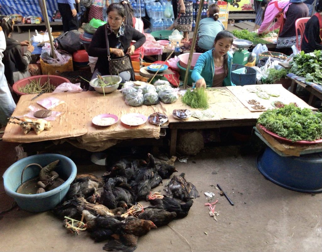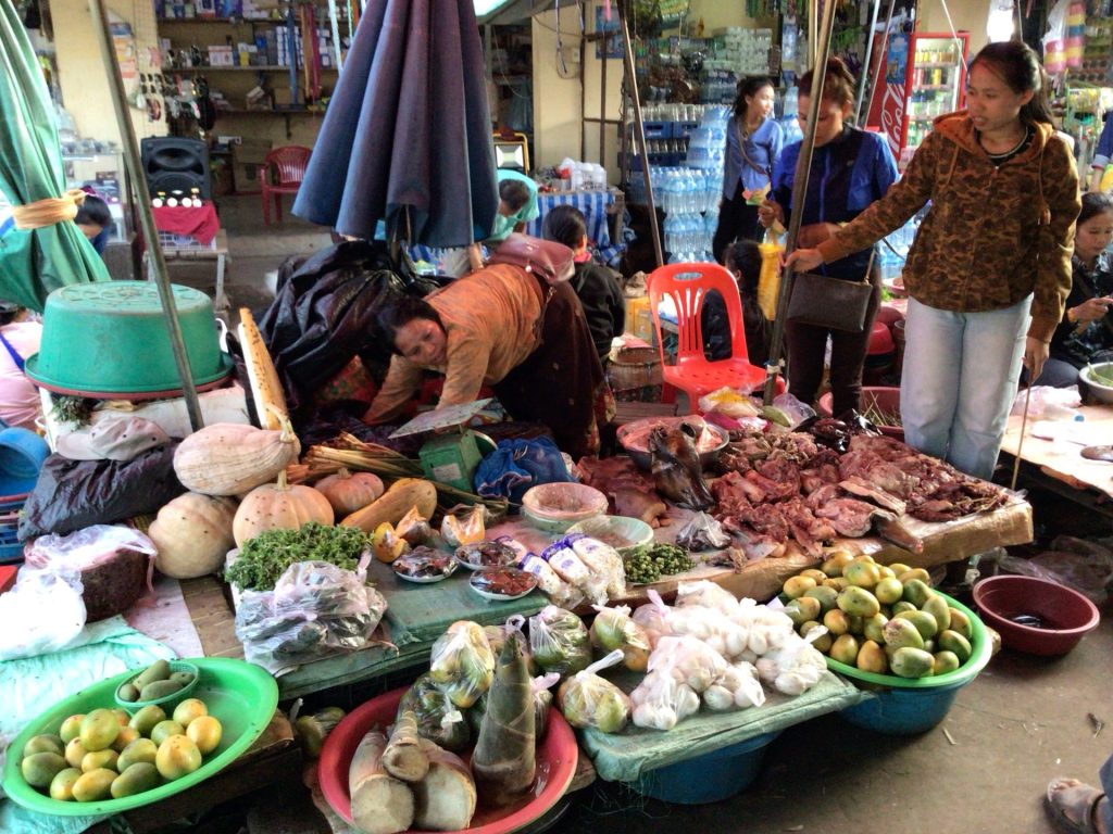 Je finis mon tour en me baladant dans le marché couvert. Je suis le seul occidental dans le coin. Ma présence ne passe vraiment pas inaperçue. D’autant plus que, vu ma taille pourtant dans la moyenne par chez nous, je dépasse tout le monde. Alors ce soir au menu, je vous propose soit des grenouilles dans le saut rose (ou des crapauds dans le bleu ciel à terre) avec de la salade …