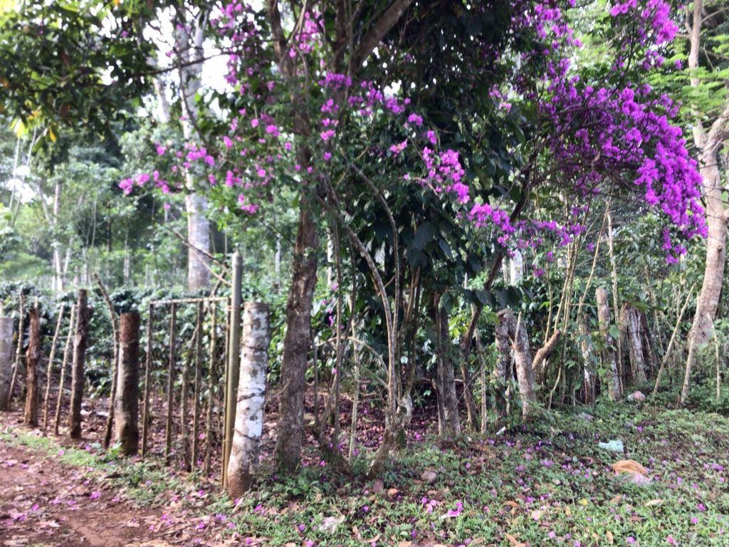 Une fois la ville derrière moi, j’attaque ma longue descente vers la plaine. Hier, c’était faux plat montant. Aujourd’hui, ce sera faux-plat descendant. Les caféiers sont toujours aussi bien dissimulés et protégés.