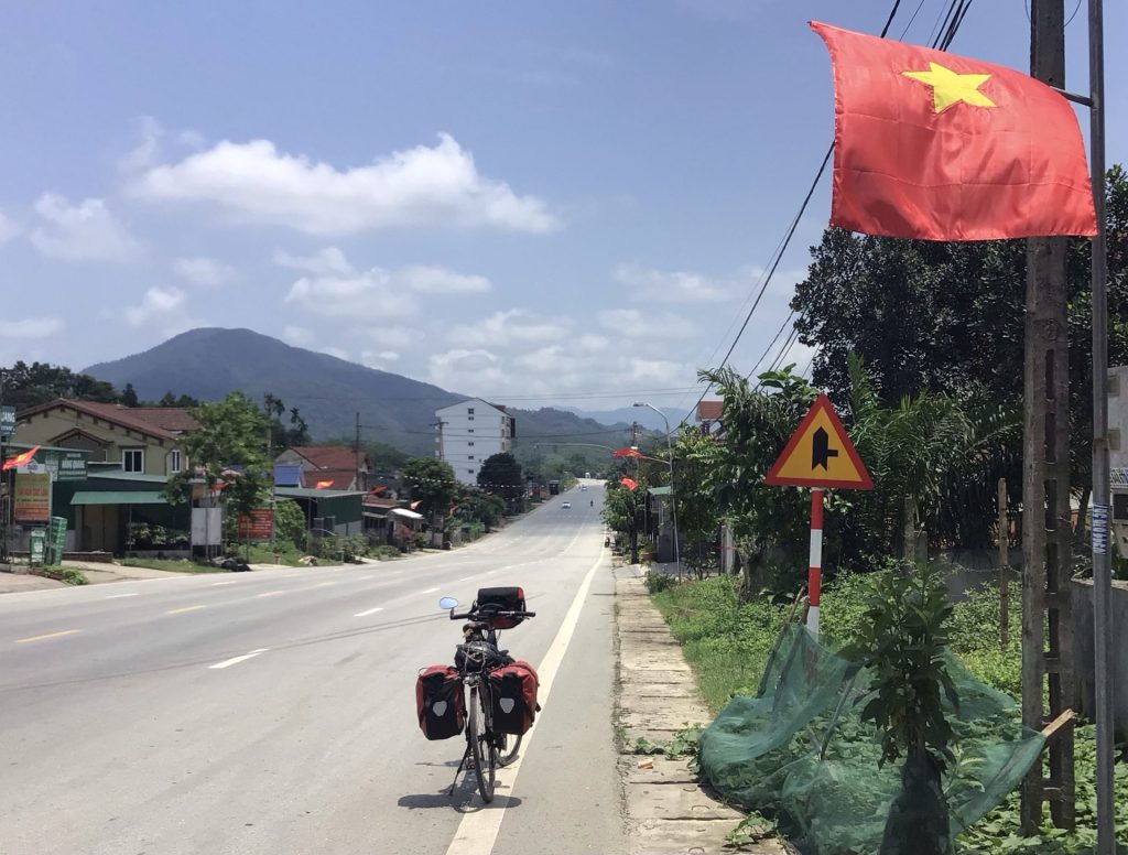 Après cette pause bien venue et de bienvenue, je reprends la route QL8A direction plein est vers la mer. Je retrouve ces larges boulevards sur lesquels flotte le drapeau vietnamien. Le vent vient à nouveau de la mer et me souffle dans les bronches. Je n’ai toujours rien mangé de solide. Je commence à avoir sérieusement les crocs. Il me reste encore une petite dizaine de bornes avant d’arriver à Pho Chau qui sera finalement le terme de cette étape. Bien que je sois sur la réserve, cela devrait tenir.