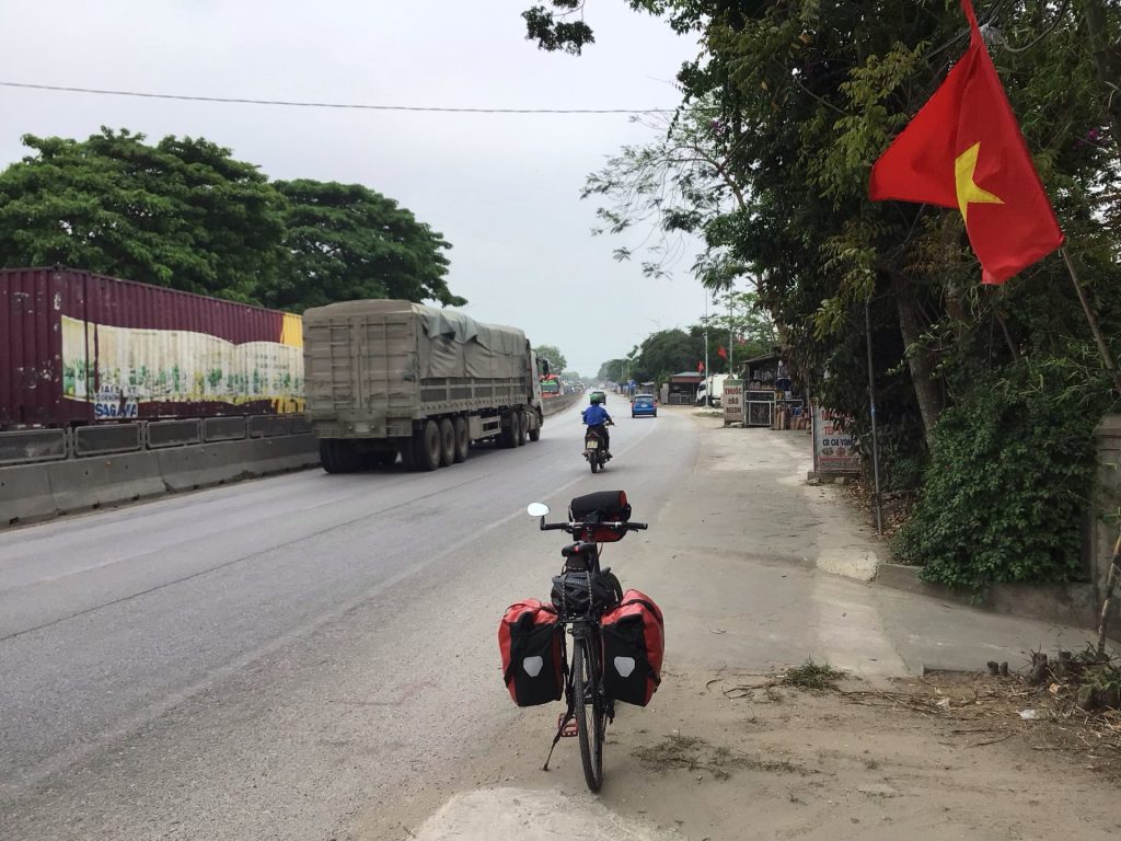 Par contre, le bonheur a toujours une fin. Après 2 heures et 1 regonflage de pneu, je suis obligé de retrouver la QL1 pour emprunter un pont traversant le fleuve Sông Yên. Le contraste est saisissant. Je retrouve bien mes drapeaux vietnamiens mais aussi voitures, bus, camions, pollutions et coups de klaxon intempestifs. Une horreur !