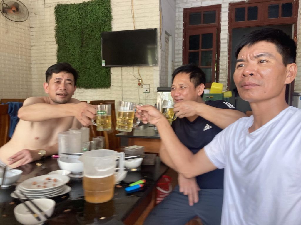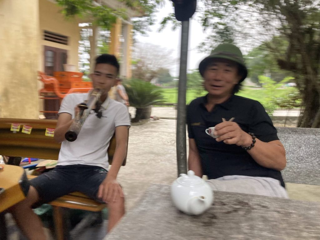 Peu avant 14h00, j’arrive à destination. Sans hébergement sur mes traceurs, il me faut à nouveau partir à la pêche aux infos pour dénicher un hôtel. Peu avant la sortie de cette petite ville, je trouve mon bonheur et retrouve les prix pratiqués un peu partout au Vietnam : 200.000VND (8€) la chambre avec air cond’. C’est l’heure de mon petit moment de bonheur après ces longues étapes : douche et sieste ! Vers 15h00, je sors de l’hôtel à la recherche d’un café. Alors que je marche tranquillement sur le trottoir, je me fais à nouveau interpeller par 3 hommes attablés dans un restau. Je m’arrête. Ils m’invitent à m’installer à leur table. C’est reparti pour la séance de questions-réponses avec traducteur. Et aussi pour faire des libations à la gloire du Vietnam.