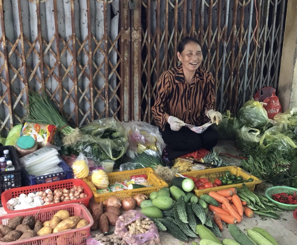 A nouveau, l’ambiance est à la rigolade avec ces femmes. Alors que je demande à la vendeuse si je peux la prendre en photo et qu’elle accepte fort gentiment, sa copine insiste pour qu’elle tombe son masque. Avec le sourire, c’est quand même beaucoup plus sympa ! Evidemment, à la vue de tous ces beaux légumes, j’en profite pour envoyer de gros bisous à tous mes collègues de l’Arche-en-Pays-Toulousain. Avec une pensée particulière pour la Belle Carmina, la co-responsable de cet atelier au sein de l’ESAT, qui vient de rentrer dans les 50è hurlants il y a 2 jours. Gros bisous.