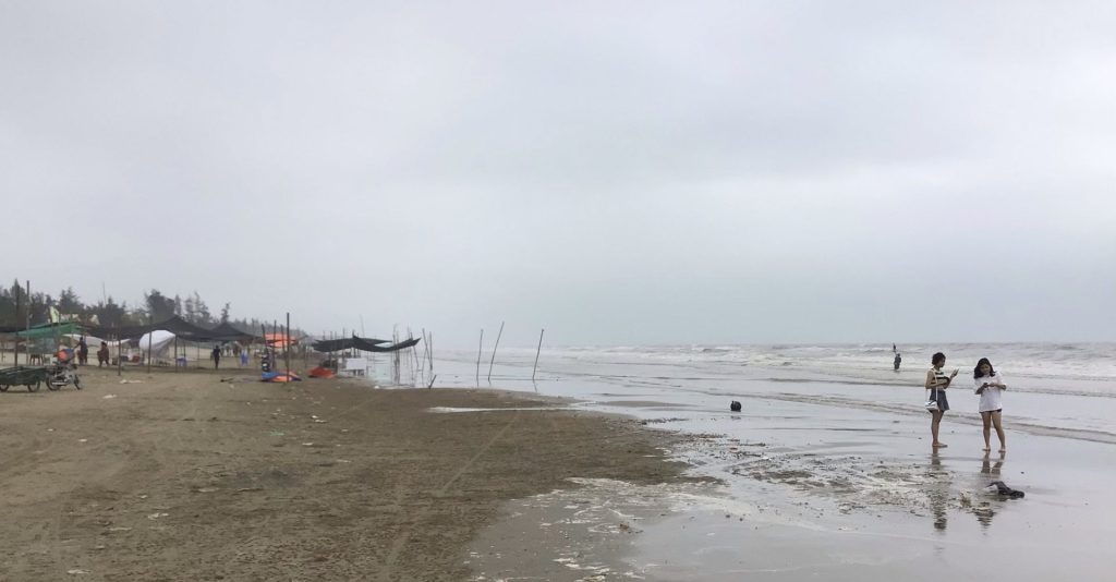 Heureusement, cela ne dure que quelques kilomètres avant que je ne replonge vers la côte, mais aussi la plage et la mer que je retrouve à Quang Thai. Le temps est toujours couvert. La plage et la mer n’incitent pas vraiment à la baignade. Seules, deux ados prennent des selfies et font trempette des pieds alors que, derrière, un pêcheur à pied installe son filet.