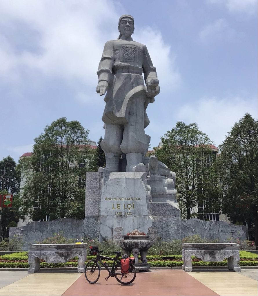 Et, miracle, ce couple super sympa a en stock des chambres à air en 700×35. « Tout se fera ! ». Mais il était temps parce que ma chambre à air est maintenant vraiment percée. Je profite de l’atelier et des outils pour enlever enfin cette limaille de fer insérée dans le pneu puis coller une nouvelle rustine sur ma chambre à air. J’en achète deux nouvelles. Comme cela, j’en aurais comme papa deux en réserve vu que je vais bientôt attaquer la montagne et des routes pas forcément carrossables. En sus, le patron m’offre une paire de poignées de guidon, les miennes étant vraiment nazes. Une fois les pneus regonflés à bloc et ce souci évacué, j’en profite pour visiter cette grande ville et, notamment, admirer cette gigantesque statue en granit représentant Lê Lợi (1385-1433).
