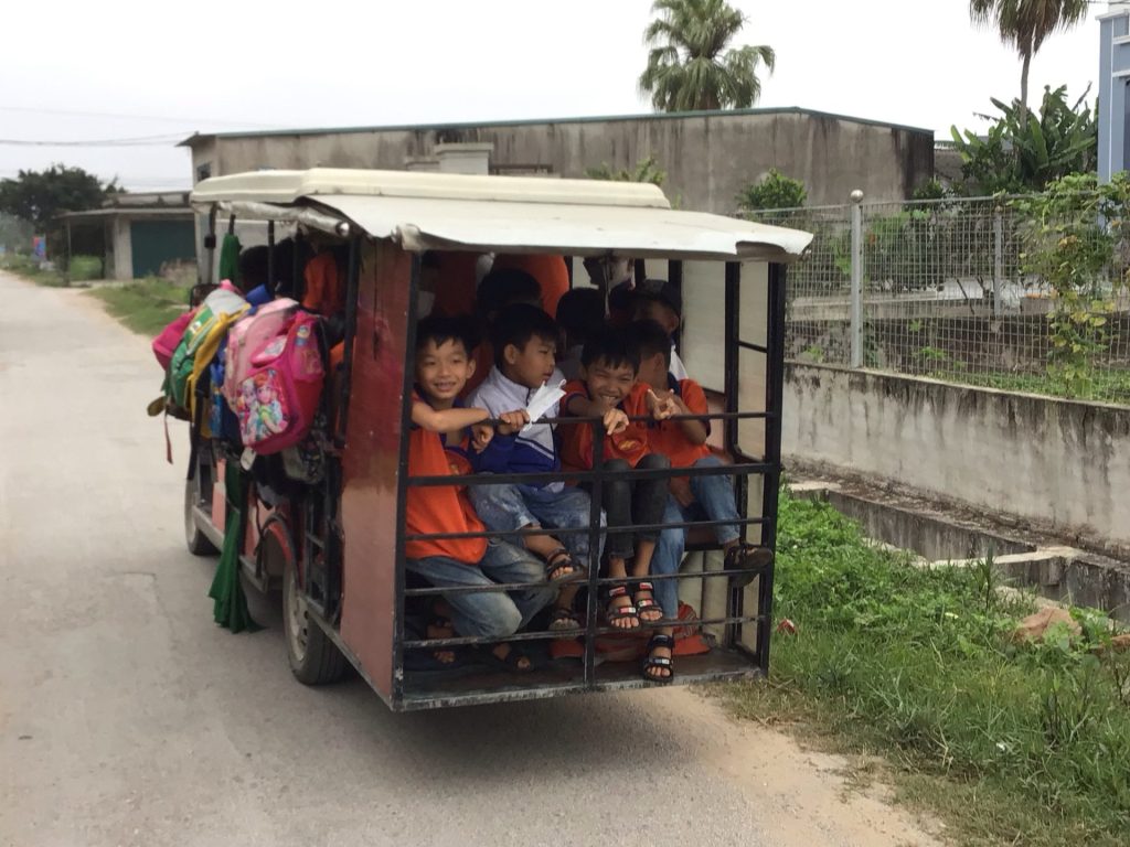 Ma trace emprunte donc une petite route parallèle à la QL1. C’est un véritable labyrinthe entre cette route principale et la côte. De multiples sentes bétonnées ou pas partent de tous les côtés. Je laisse mon GPS allumé et le suis scrupuleusement à la trace. Cette zone est également très peuplée. Je traverse de nombreux hameaux. De plus, pratiquement aucune voiture, aucun camion ne circule sur ces axes. Seuls les 2 roues motorisés ou pas les empruntent. C’est beaucoup plus calme malgré les coups de klaxon des scooters aux croisements. Je tombe aussi sur le car de ramassage scolaire. En fait, c’est une golfette électrique transformée en bus scolaire ! Les gamins s’agglutinent dedans. Cela a l’air de bien les amuser. Voilà une idée à creuser pour éviter que les parents prennent leur bagnole pour déposer leur gamin directement dans le hall de l’école. Il existe déjà les pédibus (des parents encadrent les enfants pour les emmener à l’école à pied), les vélobus (même principe mais à vélo) … Voilà la golfette bus !