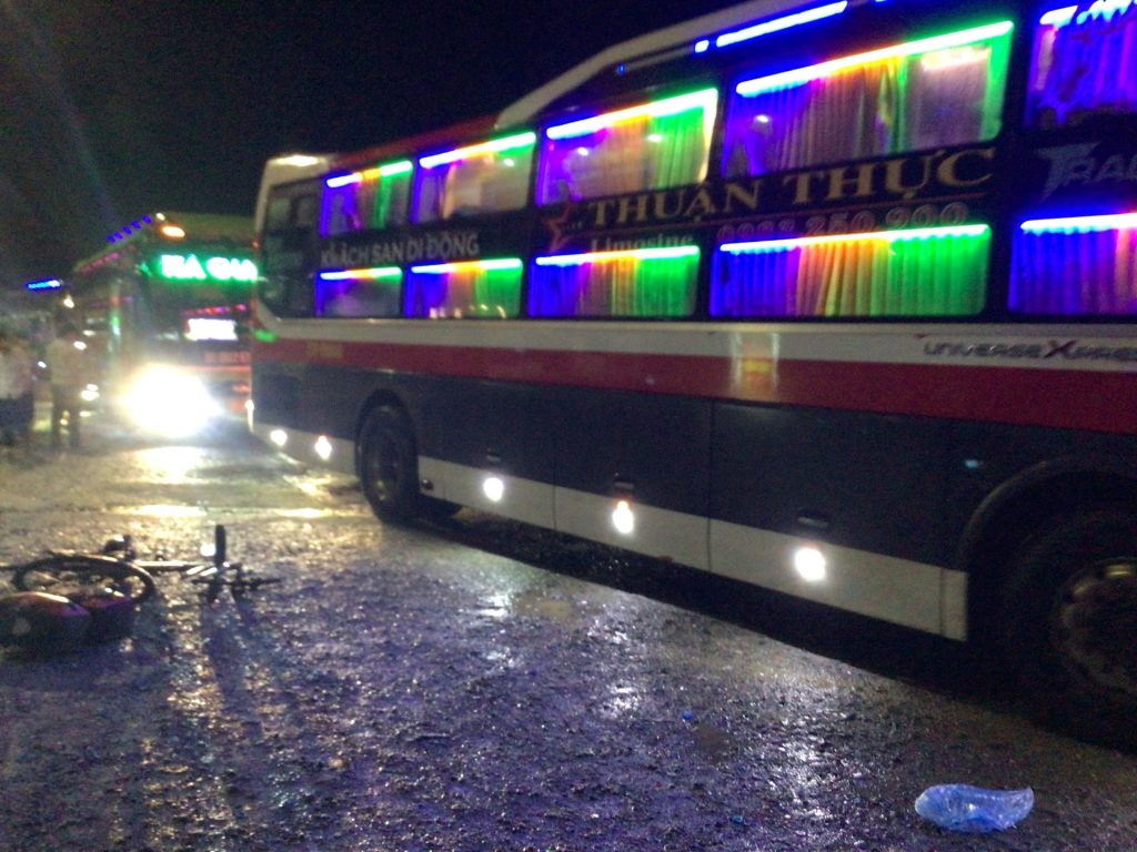 Le trajet se passe sans encombre. Il est agrémenté d’une pause-pipi dans la nature (où les femmes pissent devant ma fenêtre !), d’une pause-dîner à 22h30 (où je craque mes derniers sous), d’un arrêt-accident (où un scooter a été fauché par une bagnole), d’un spectacle pyrotechnique (où les éclairs illuminent les montagnes) et d’une animation gratuite dans le bus (où un monsieur discute avec sa dame qui se trouve de l’autre côté et un autre regarde, et surtout écoute sans casque, une débilité sur son téléphone). A 2h30 du mat’, je suis réveillé par un gars. Il me semble comprendre qu’il me demande « WC ? ». Je lui fais signe que « Non. Ça va. Merci. ». En fait, nous sommes arrivés. Je suis le dernier à quitter le bus. Haka2 a été déposé par terre avec mes sacoches sur un improbable trottoir. Il pleut. Il fait nuit. Le réveil est quelque peu brutal.