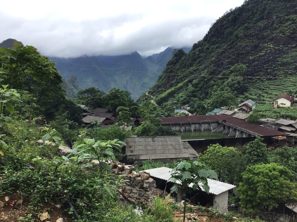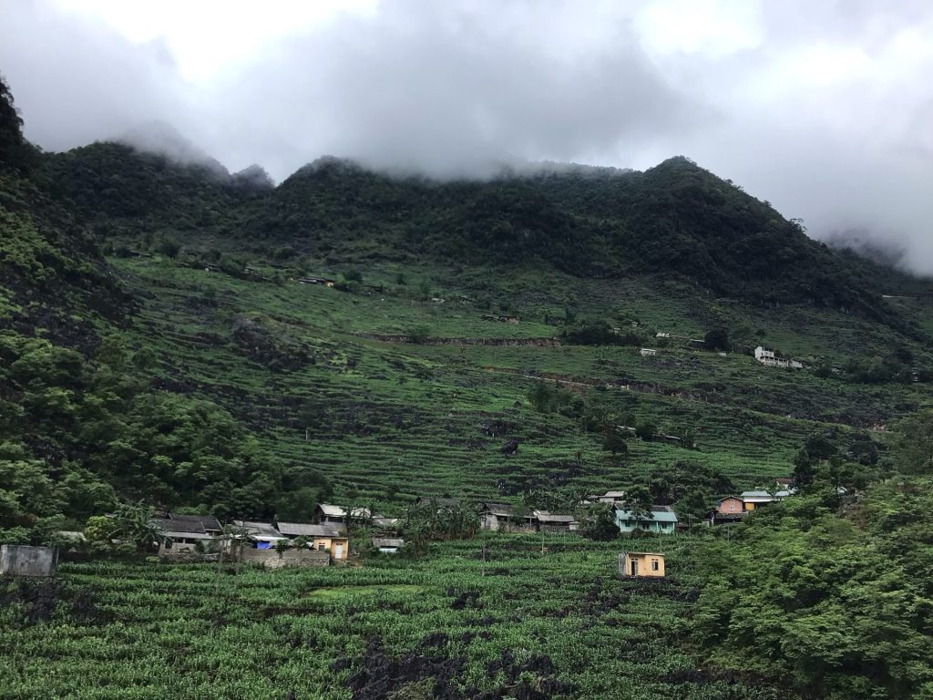 Je me dirige maintenant vers Quan Ba. La route grimpe à nouveau pendant de nombreux kilomètres. Des hameaux sont éparpillés dans ces montagnes sauvages. Autour de ces hameaux, le moindre recoin est cultivé en terrasse. C’est impressionnant.
