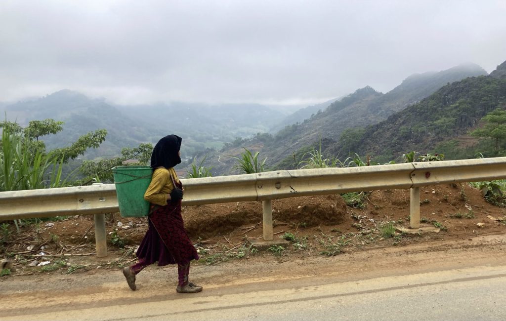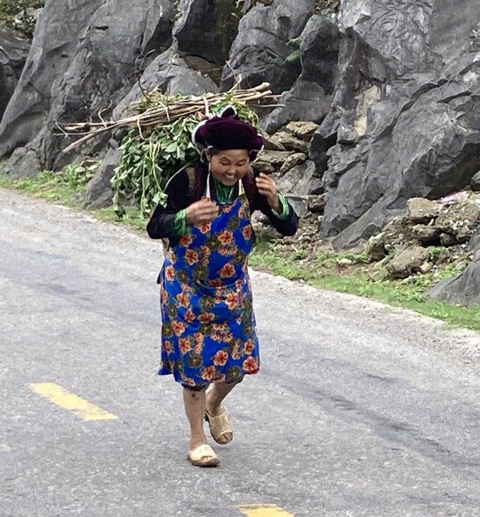 Je repars et double une femme alors qu’elle ramène un chargement de feuilles et branches dans son sac à dos. Décidément, je ne vois que des femmes au boulot dans les champs. Et les messieurs, ils sont passés où ?