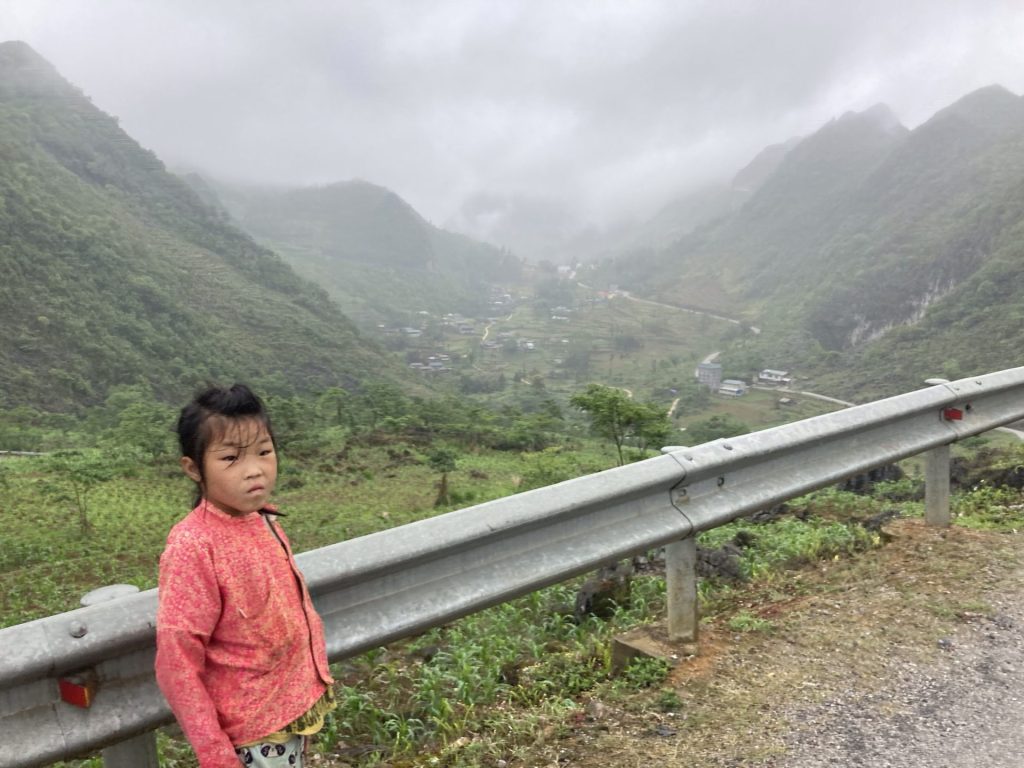 Après cet intermède coloré, je repars sur ma route montagnarde. Au milieu de nulle part, je double une gamine qui chemine le long des balustrades. Je lui demande la permission de la photographier. Elle acquiesce mais parait toute timide devant ce vieil occidental sur son scooter.