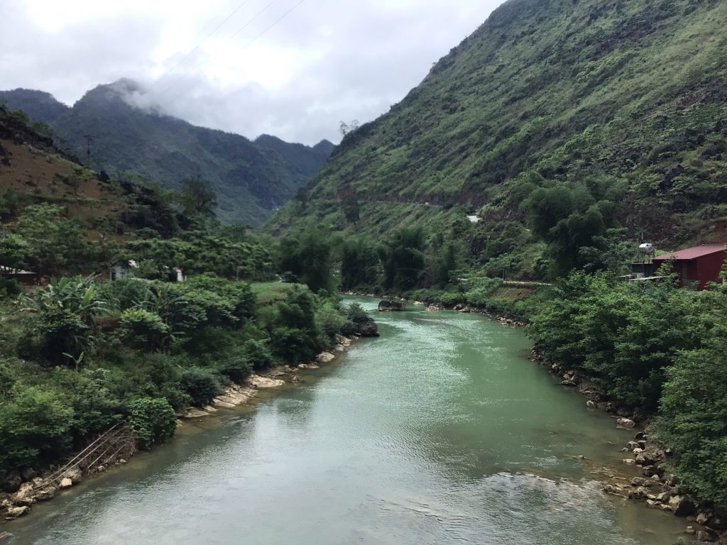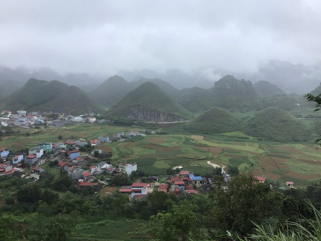 Après être passé au col, je bascule dans la descente vers la ville de Tam Son. J’ai également bien fait de prendre mes lunettes de soleil qui me protège du vent et de la pluie. Comme les rares villes que je vais traverser dans cette journée, elles sont construites dans de petites vallées. Les cultures y sont nombreuses.