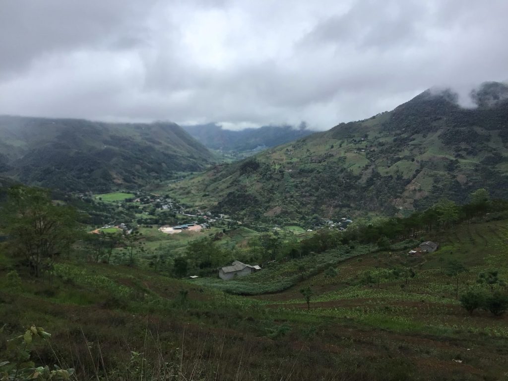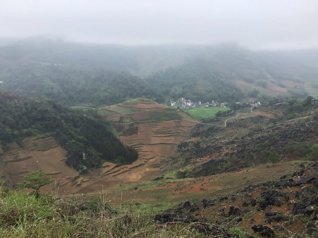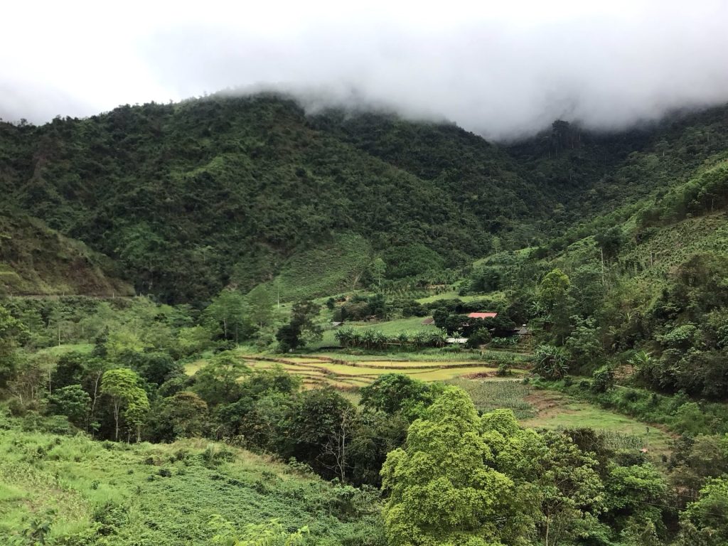 Alors que je grimpe vers ma destination finale sur cette route à flanc de montagne, j’aperçois des bourgades perdus dans des fonds de vallée. Les flancs de montagne ont été, ici, ratiboisés pour de nouvelles futures cultures en terrasse. Alors que, en fond de vallée, les rizières s’étendent au pied de la bourgade.