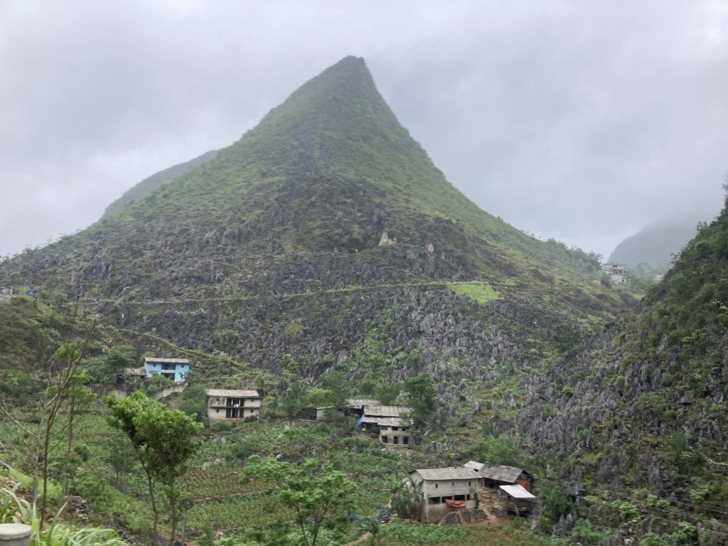 Les nuages effleurent les sommets environnants qui culminent à plus de 1.500m d’altitude. Je ne pense pas que je verrais le soleil aujourd’hui. Cela n’a pas l’air de se lever. Malgré cela, je me régale de ces paysages sauvages. En parlant de régalade, j’arrive dans la ville de Yen Minh où je m’arrête déjeuner dans une gargote. Je suis surpris d’ailleurs par le nombre de gargotes quand je traverse ces villes. J’en choisis une au pif. Je suis seul. Je demande à la patronne du riz frit. Elle m’apporte un riz festif accompagné de morceaux d’omelettes, porcs, poulets frits.