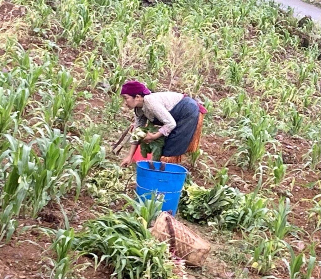 Plus loin, c’est un vieille femme qui attire mon regard alors qu’elle ramasse des choux (ou des mauvaises herbes ?) entre des pieds de jeunes maïs.