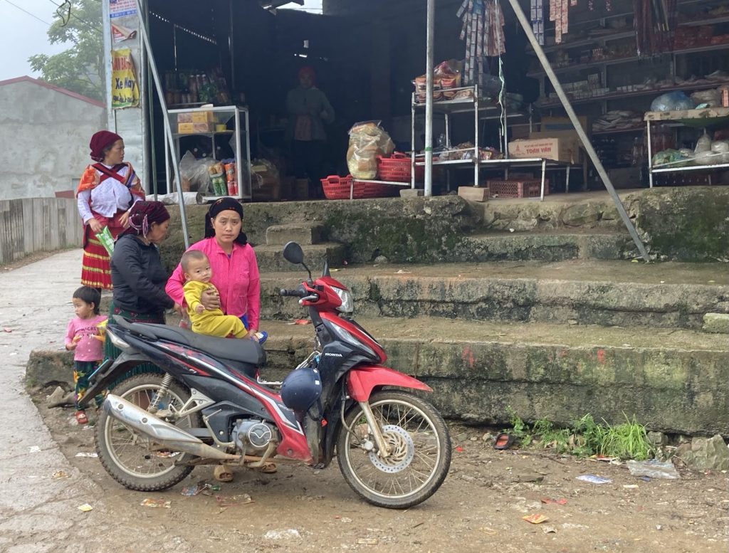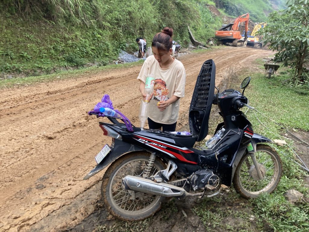 Je compte les bornes kilométriques qui mènent à la prochaine ville de Du Gia distante d’une vingtaine de bornes. Cela ne va pas le faire. Je vais devoir m’arrêter quémander de l’essence dans une ferme. Je traverse alors le hameau de Minh Son. Et, « comme tout se fera », je déniche une gargote avec quelques bouteilles sur un présentoir. Je m’arrête. Une toute jeune femme regarde son portable. Son jeune fils et le papa dorment dans le lit à côté de la boutique. Je lui demande si mon scooter peut boire une de bouteilles du présentoir. Elle acquiesce. Sauvé.