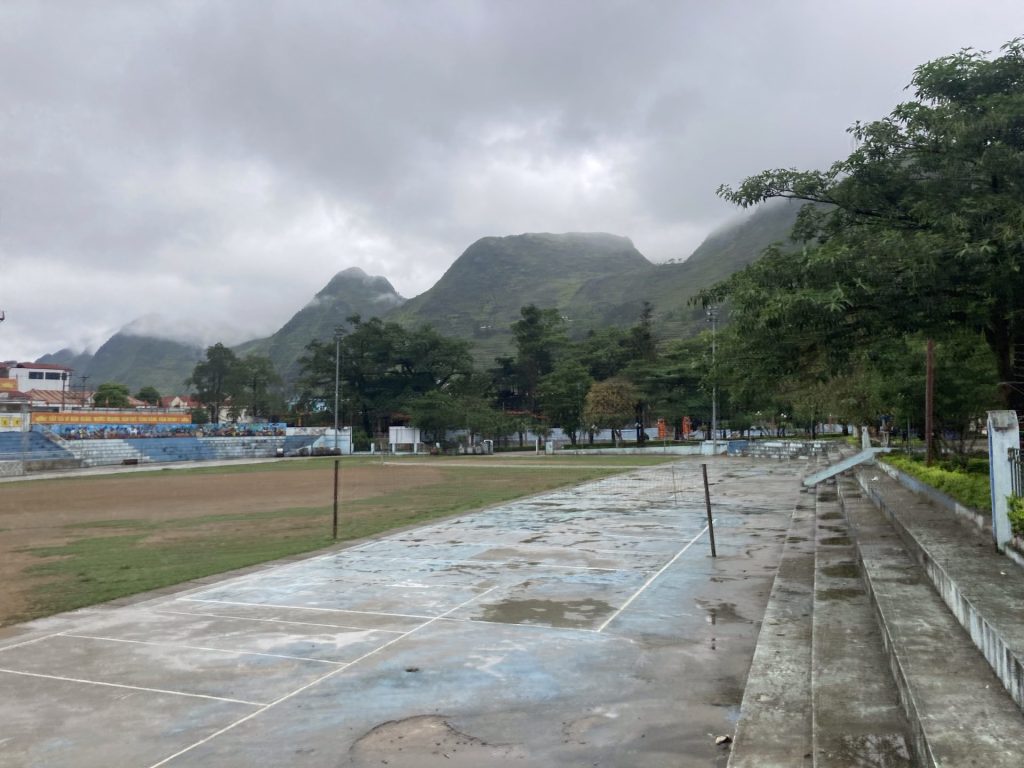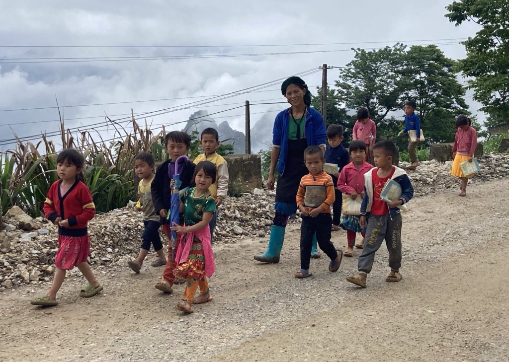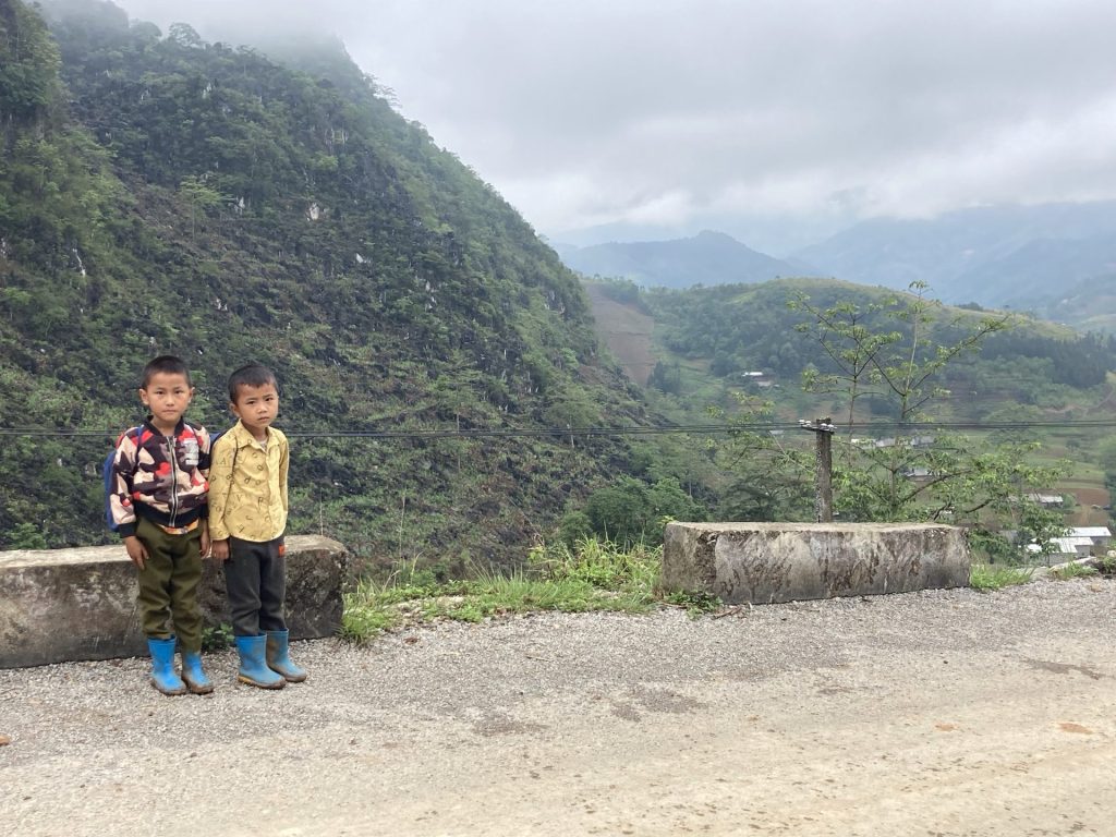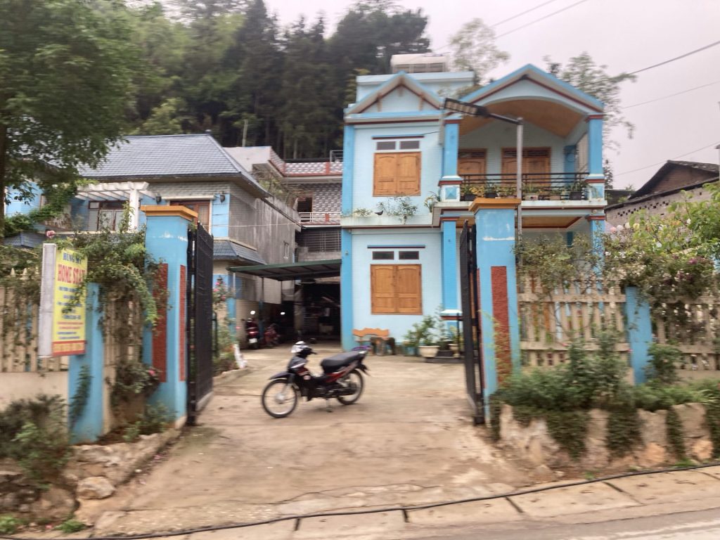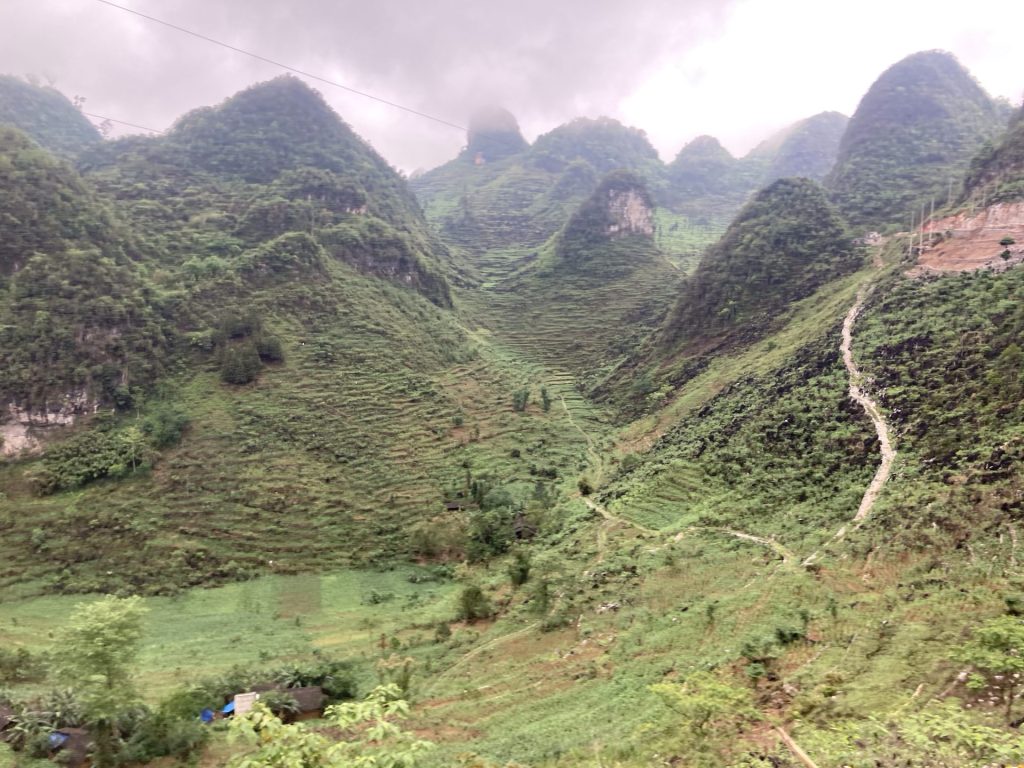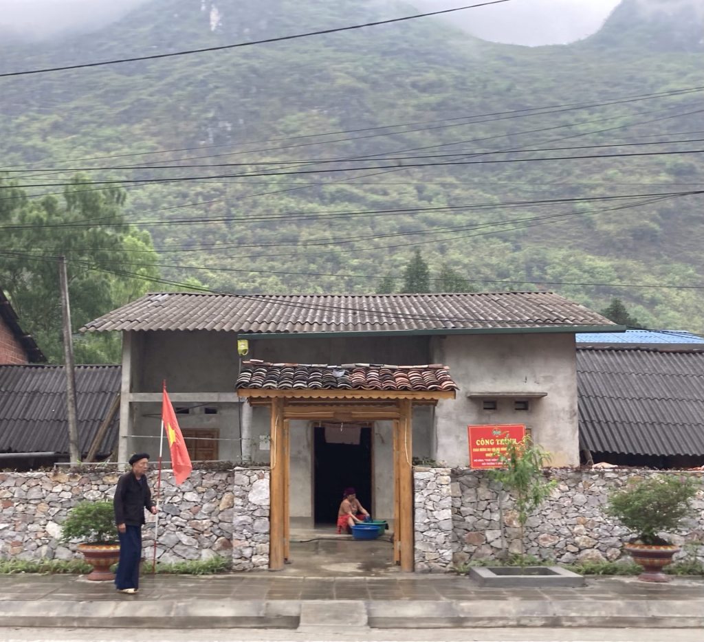 Après l’ascension et la descente de cette montagne, j’arrive dans la vallée et ville de Meo Vac. Les maisons sont identiques et alignées le long de la grande rue principale. De même, un porche a été érigé devant chaque maison. Comme partout dans ces contrées, la vaisselle est faite à la main sans produit dans des bassines. L’eau est réutilisé pour l’arrosage. Il n’y a pas souvent l’eau courante. Et c’est comme cela qu’on s’aperçoit que l’eau s’écoule vite. L’eau est un bien précieux. Après des décennies de gaspillage, nous commençons seulement à nous en rendre compte avec le dérèglement climatique et les sécheresses qui frappent nos régions occidentales. Il est temps ! Quant au vieux monsieur avec ses vêtements traditionnels, j’ai l’impression, illusion d’optique, qu’il se balade avec le drapeau vietnamien.