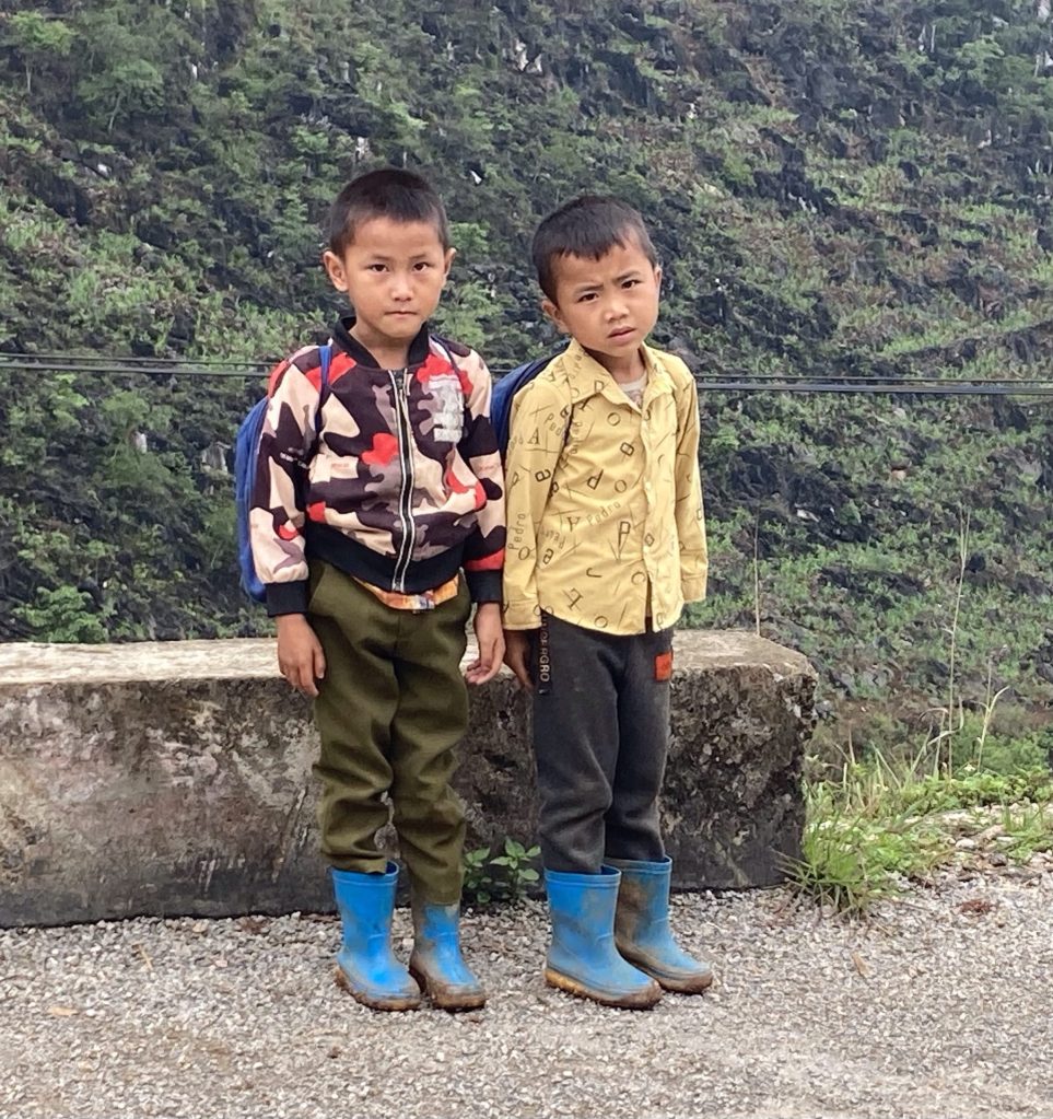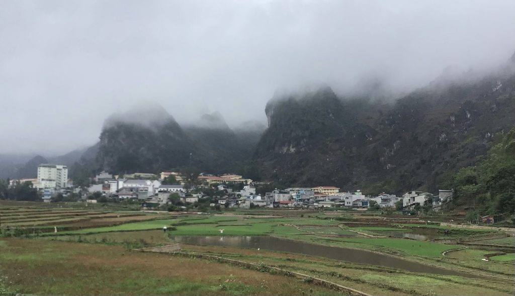 Je m’arrête en ville pour m’y acheter un casse-croûte et un gâteau à la banane. Je me pose sur un banc devant l’école secondaire pour casser la croûte. Je suis au point le plus au nord de mon périple asiatique. La frontière chinoise forme un chapeau chinois au-dessus de Dông Van. La ville de Lūng Cú distante de ?? Kms d’ici est l’endroit le plus au nord du Vietnam. Cette ville est prévue sur le Loop à scooter mais il faut 1 jour de plus. Je quitte donc Dông Van pour redescendre au sud.
