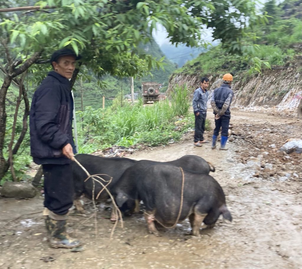 Arrivé à ce village de Sung Mang, c’est à nouveau le chantier. Comme la route est trop défoncée, je suis obligé de me faufiler entre les cochons tenus en laisse par ce vieux monsieur et les gars du chantier.