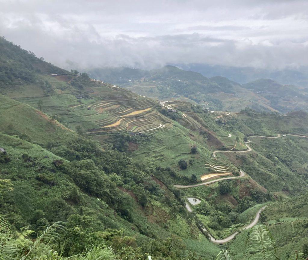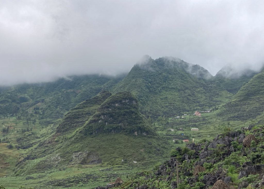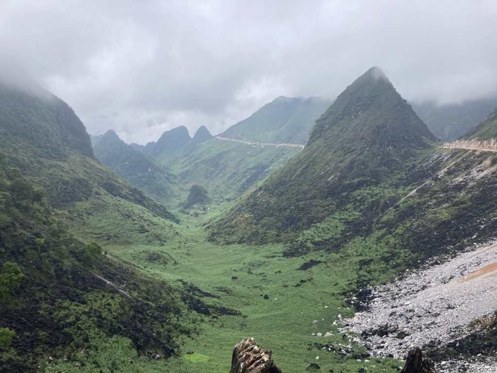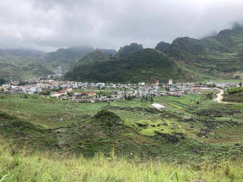 Par contre, je ne poursuis pas ma route sur la QL4C que j’emprunte depuis le départ. Je bifurque sur un réseau de petites routes encore plus sauvages. Je me dirige au sud-ouest vers la ville de Mâu Duê. En grimpant un nouveau col pour changer de vallée, je me retourne pour voir une dernière fois la ville de Meo Vac.