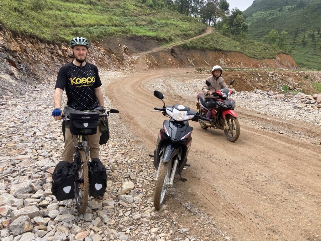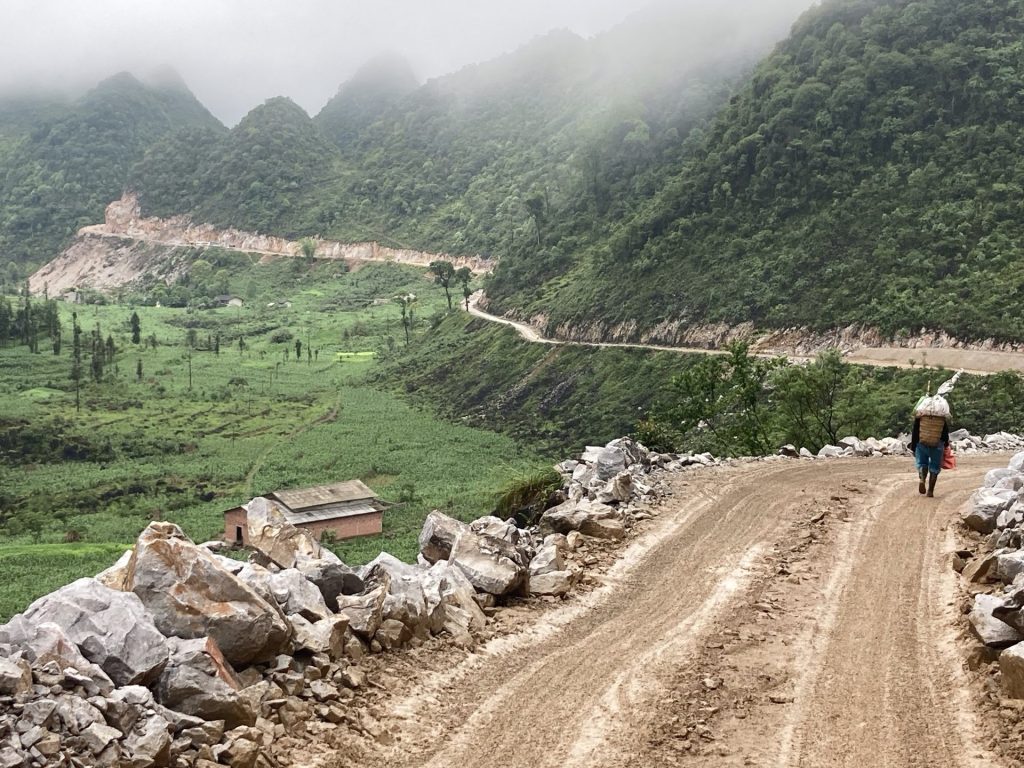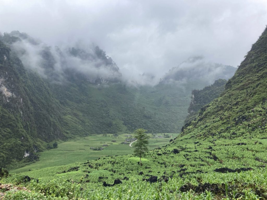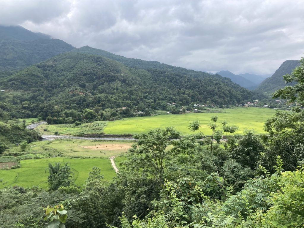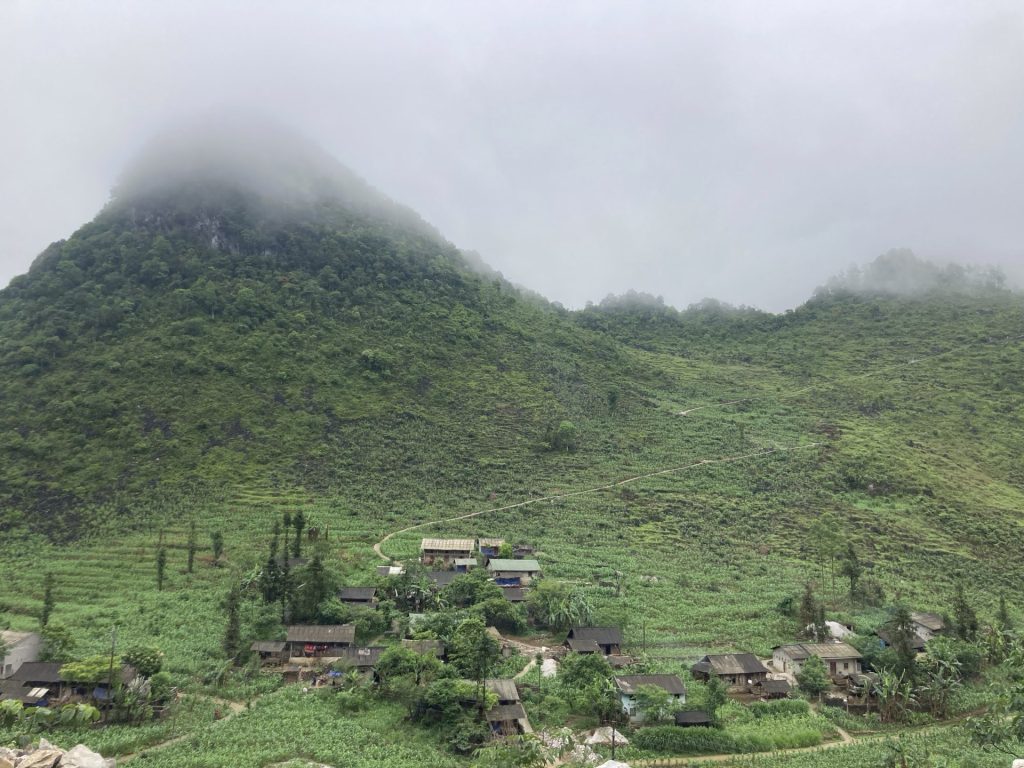 Par contre, je ne poursuis pas ma route sur la QL4C que j’emprunte depuis le départ. Je bifurque sur un réseau de petites routes encore plus sauvages. Je me dirige au sud-ouest vers la ville de Mâu Duê. En grimpant un nouveau col pour changer de vallée, je me retourne pour voir une dernière fois la ville de Meo Vac.