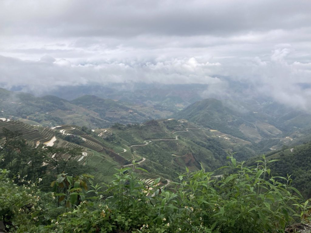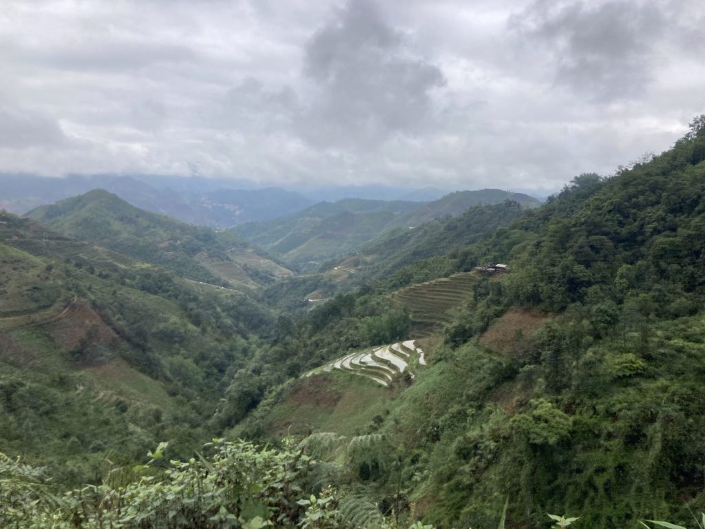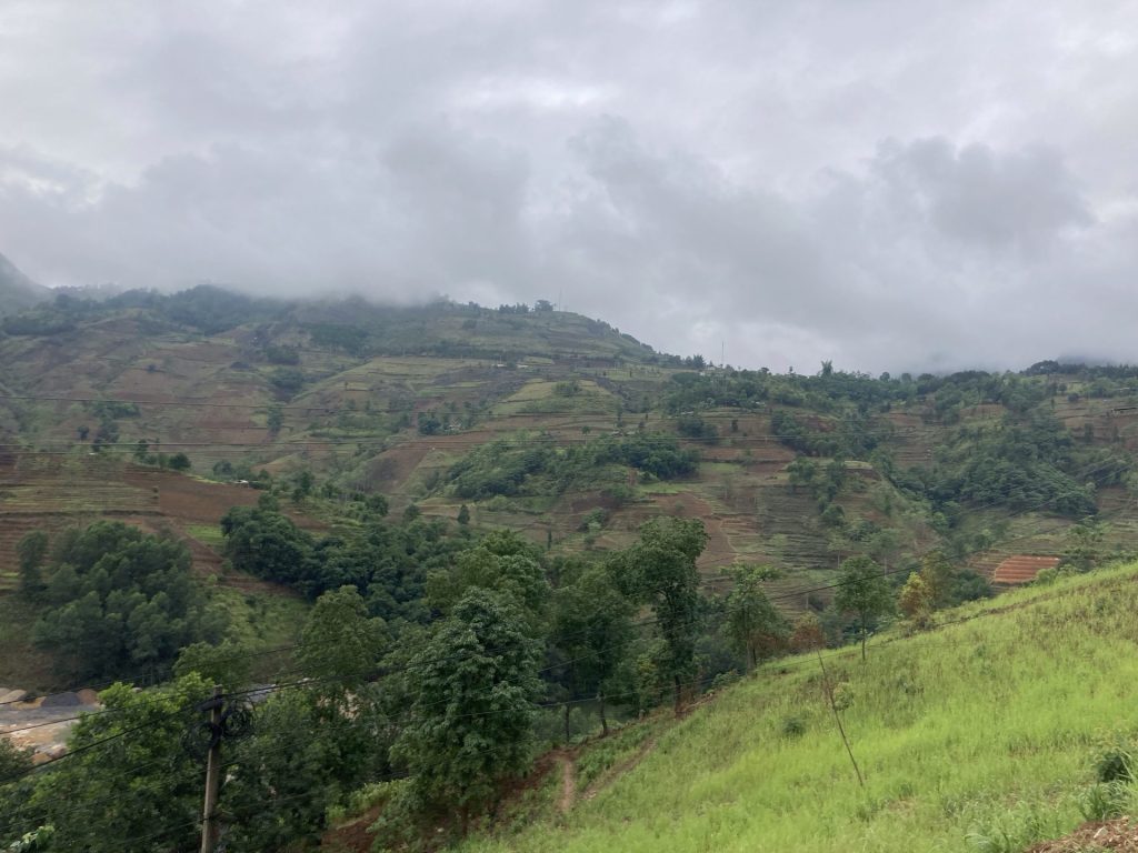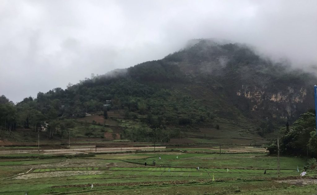 Ce matin, le ciel était légèrement voilé. Mais ça se couvre à nouveau sur les sommets. Par contre, bonne nouvelle, il ne pleut pas. Les paysan.nes sont déjà dans les rizières.