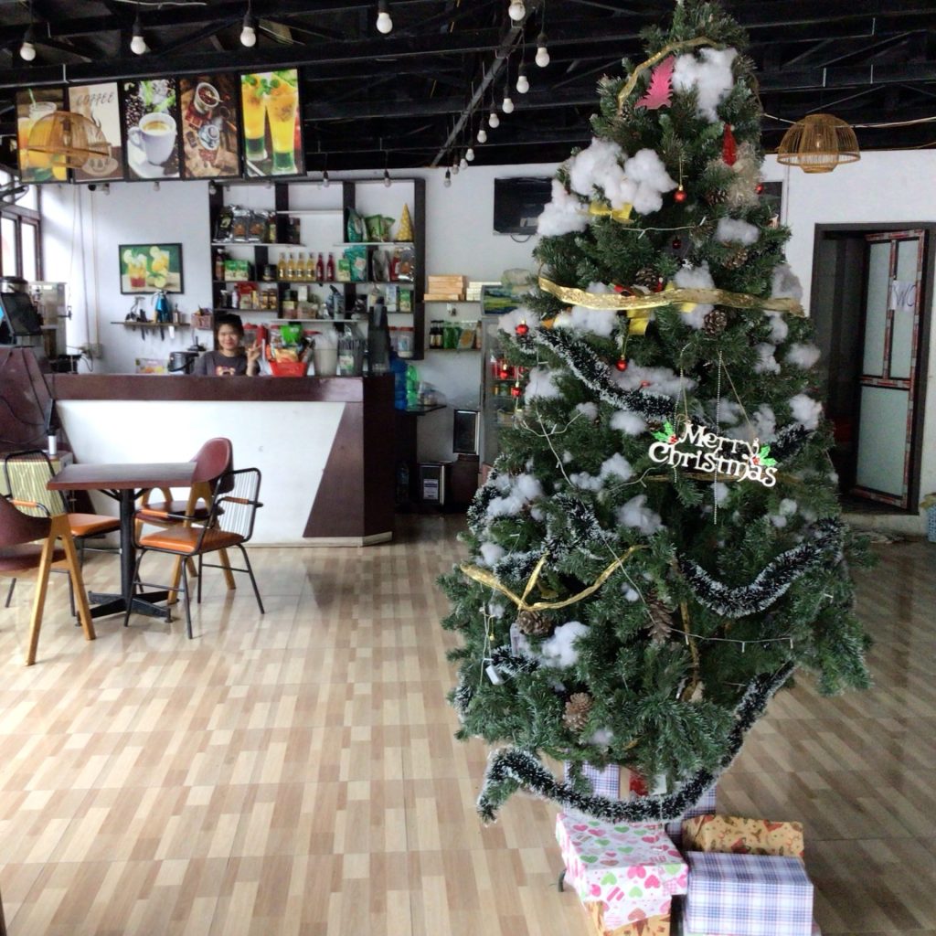 Je rejoins enfin la route nationale QL34 qui me ramène à la maison. Il me reste une trentaine de bornes. Par contre, j’ai besoin d’un coup de fouet. Je m’arrête dans le village de Minh Ngoc pour y boire un café glacé. J’ai tombé mon ciré jaune. La chaleur toute relative refait son apparition. Dans ce café, la déco de Noël est toujours présente. C’est original comme déco : photo avec la jeune patronne derrière son bar.