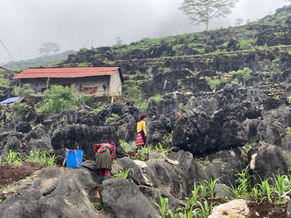 Entre les paysages et les personnages, j’ai mon iPhone qui chauffe. Ce matin, comme mon iPad est dans mon pochon en sac à dos recouvert par la cape de pluie, c’est un peu compliqué de le sortir à chaque fois. J’utilise donc mon iPhone comme appareil photo. C’est plus simple notamment pour photographier ces femmes en train de bêcher autour du maïs plané entre ces roches noires. Ils sont fous ces Hmong !