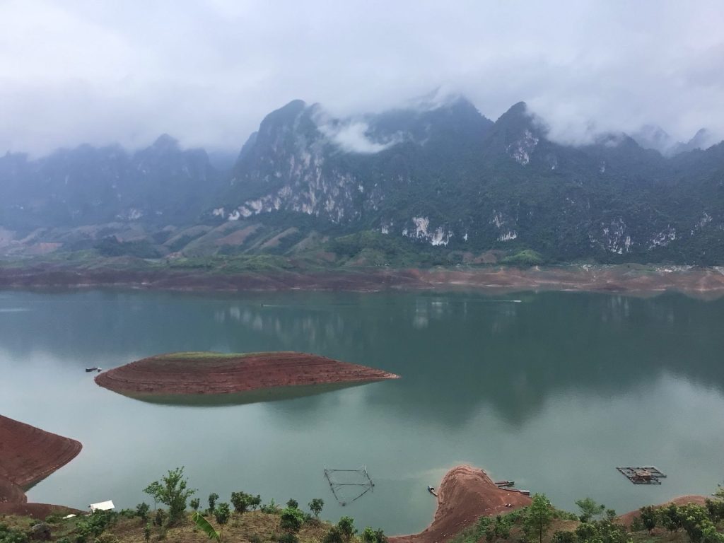 Je finis par arriver à hauteur du grand barrage que j’avais en point de mire depuis un long moment. Il retient les eaux de la rivière Nâm Mu.