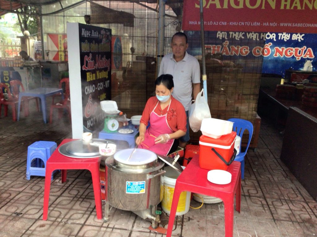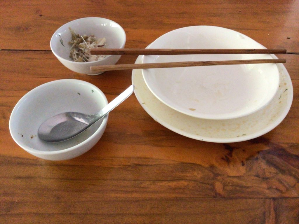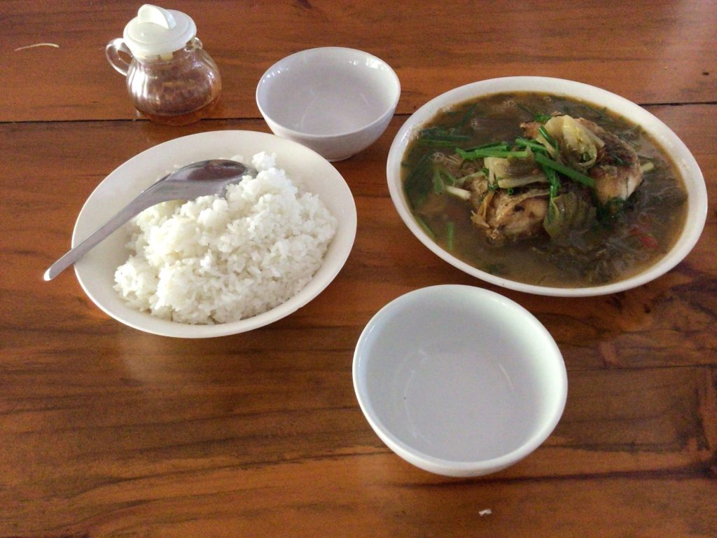 Plutôt que de regarder la carte et me prendre la tête à traduire, je commande ce que la patronne et ses deux adultes de filles mangent. Et mon choix est fort judicieux. Je vais déguster du poisson blanc de la rivière dans son bouillon de légumes accompagné de riz évidemment.