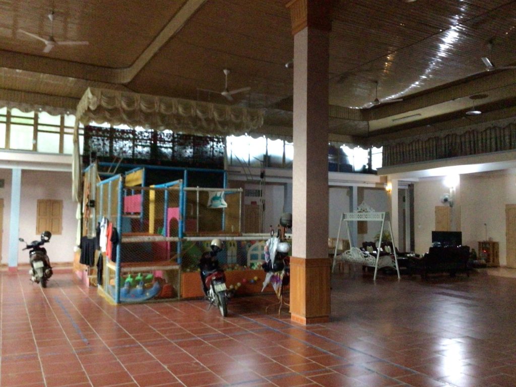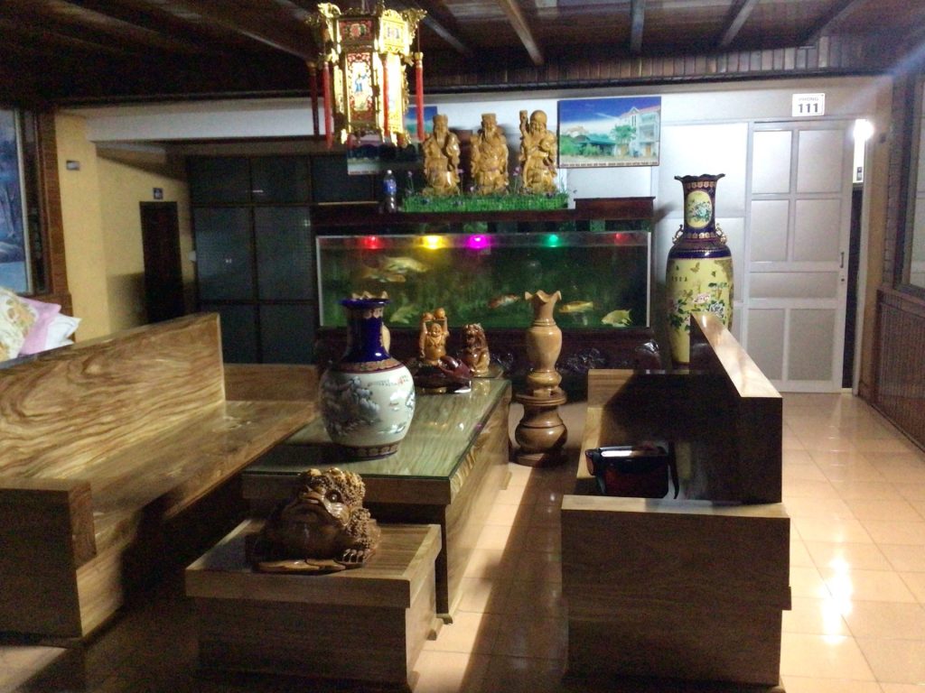 J’essaie de négocier le prix à 200.000VND comme dans tous les autres Nha Nghi mais le gérant, d’origine chinoise vu la déco et l’autel à l’entrée, ne veut rien savoir. Il me rend 250 sur mon bifton de 500. Et basta. De plus, la pluie se remet à tomber. Je n’insiste pas. Je rejoins ma chambre pour siester un peu avant de finir l’après-midi dans le cossu salon. En fin d’aprèm, je lui demande s’il pourrait me vendre une bière. Refus. Je suis obligé de remonter en ville. J’en profite pour acheter un bánh bao (petit pain farci cuit à la vapeur) que je mangerai avec mon riz de ce midi.