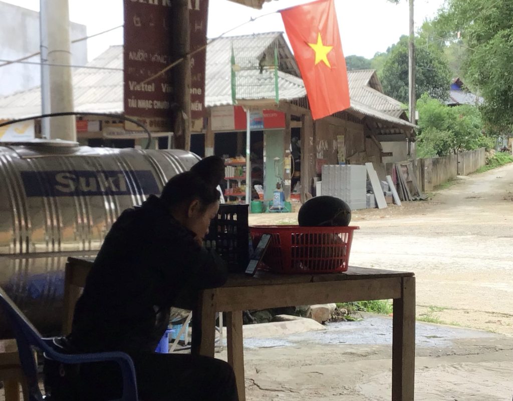 Comme partout, les autochtones passent leur temps à regarder des feuilletons ou des vidéos à la con sur leur portable. C’est également le cas de la jeune vendeuse de ce magasin. Je vous fais aussi remarquer la coiffure typique des femmes de la région. Elles se font un énorme chignon au-dessus de la tête. Je dois dire que, avec le casque par-dessus, l’effet est assez comique. J’essaierais d’en prendre une en photo si je peux …