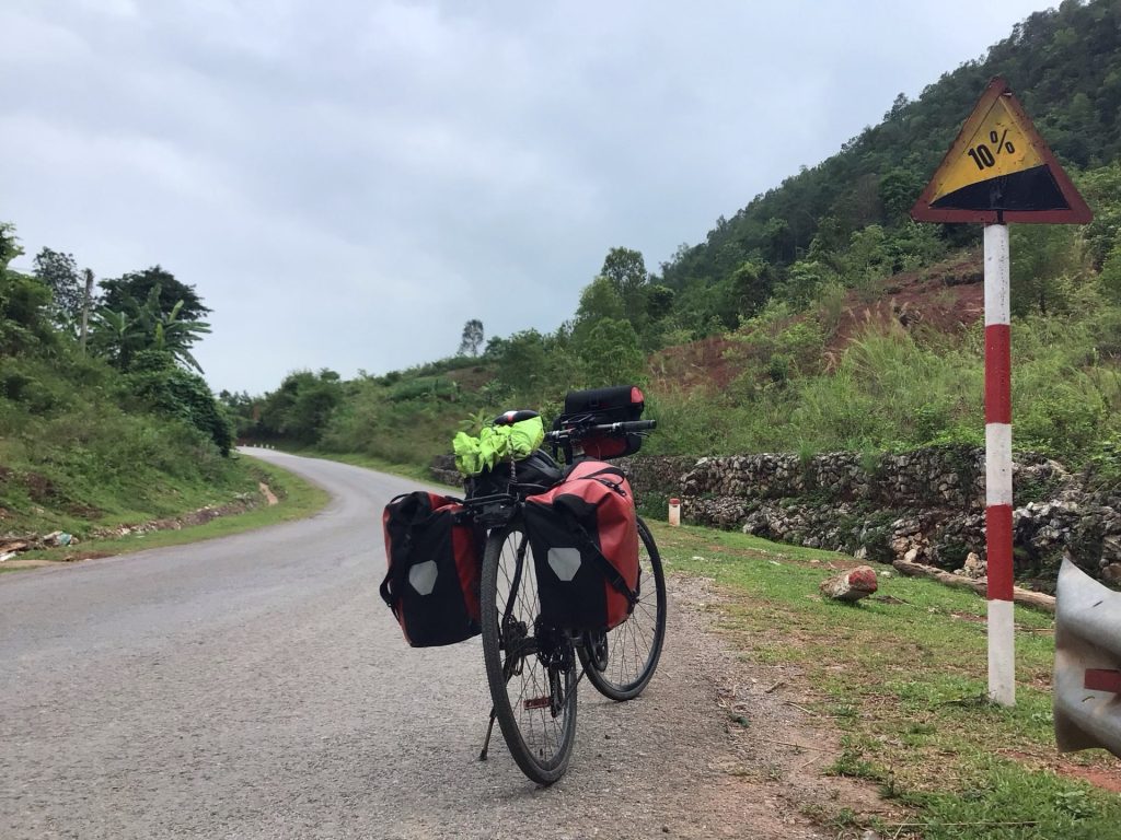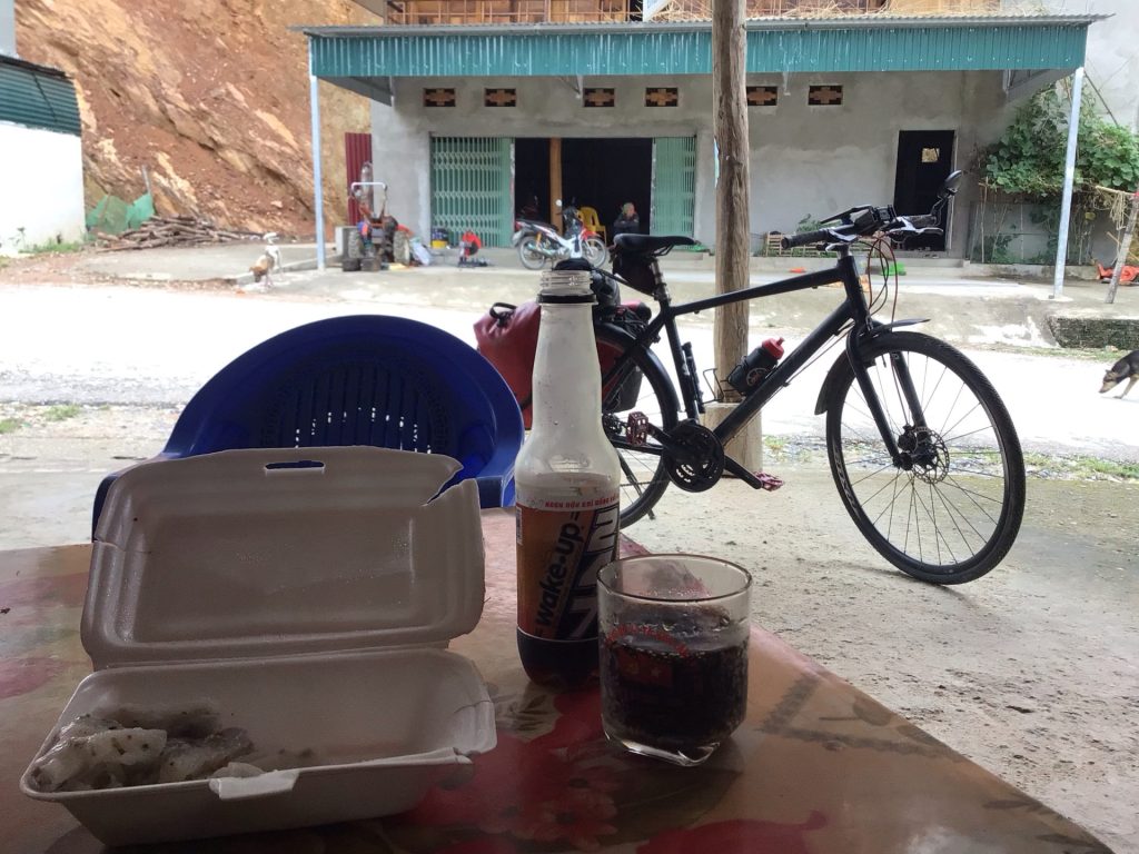 Par contre, ce matin, je n’avais plus rien à grignoter avant de prendre la route. Je ne veux pas partir le ventre vide d’autant plus que j’attaque par des enchaînements casse-pattes comme hier. J’achète un paquet de mes gâteaux roboratifs préférés. Puis je me pose dans la première gargote ouverte pour manger un Bánh Cuôn. C’est une spécialité vietnamienne cuisinée avec une large feuille de pâte à riz fermenté remplie d’une mixture avec du porc haché, des champignons et des échalotes. En plus, j’ai droit à quelques morceaux de pâté en supplément. C’est assez copieux. J’en garde une partie stockée dans une boite en polystyrène.