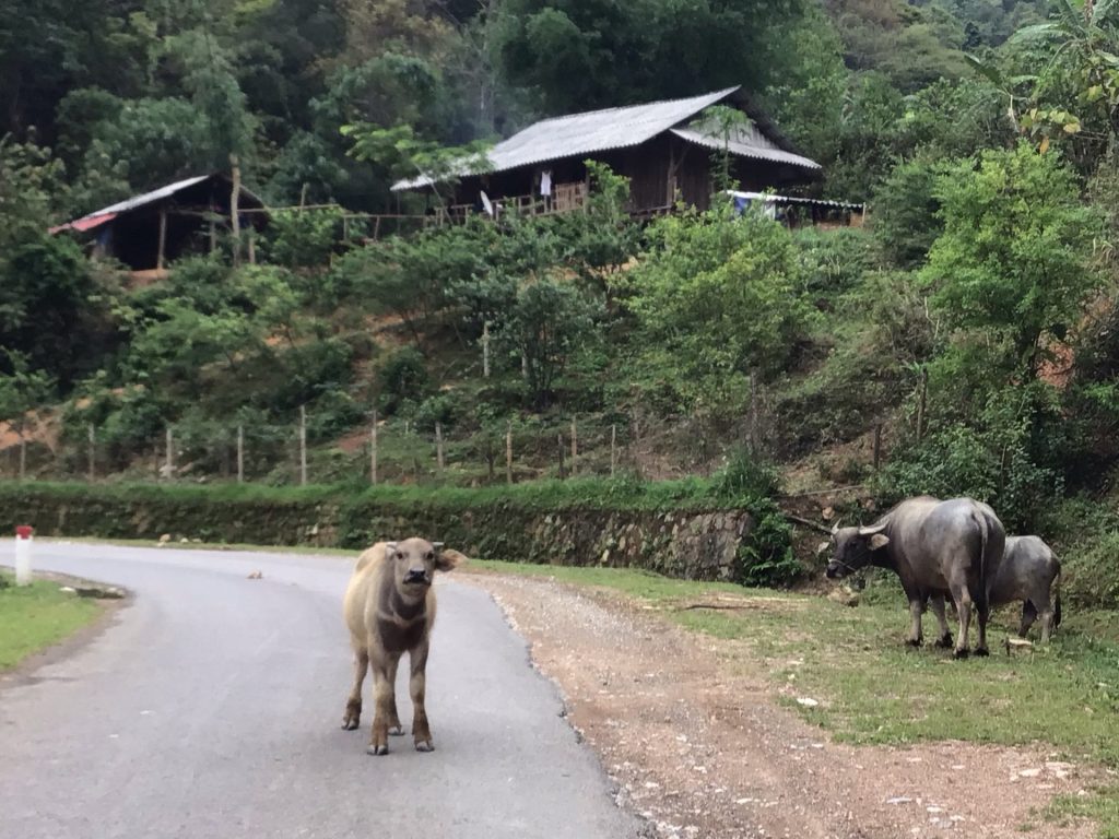 De temps en temps, je croise des animaux domestiques : vaches, veaux, cochons, coqs, poules et couvées et aussi buffles qui déambulent tranquillement au milieu de la route. Cependant, ce jeune buffle, lui, a l’air décidé à ne pas vouloir me laisser passer. La mère surveille sa progéniture au cas où. Je passe au large. On ne sait jamais …