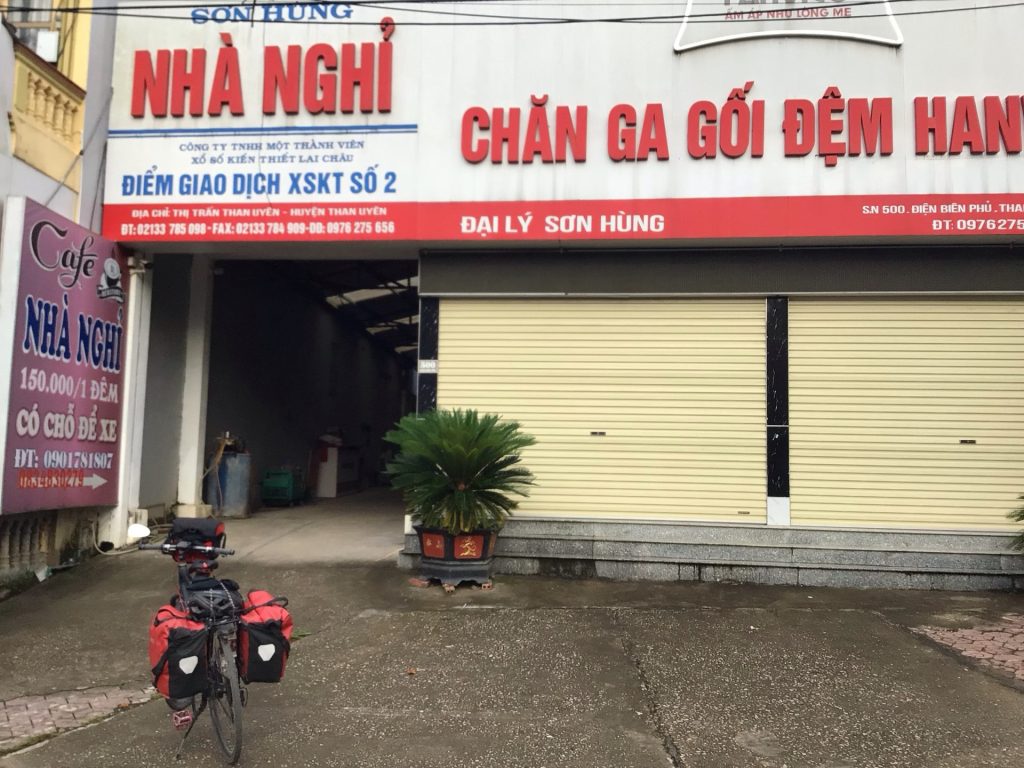 J’arrive enfin en ville vers 14h00. Je passe devant un premier Nha Nghi à l’entrée de la ville mais éloigné de tout. J’en trouve un en plein centre. J’entre dans le hall. Personne. Le patron est allongé et roupille. Je n’ose pas le réveiller. Je pars m’acheter un café en cannette et me balader dans l’artère principale. Puis je reviens en attendant qu’il émerge. C’est sa femme et son bébé qui le tire de son sommeil. Alors qu’un couple de jeunes clients descend d’une chambre et que j’en demande une au patron, il me fait ce signe caractéristique de la main qui veut dire non. Je ne comprends pas. J’insiste. Lui aussi. C’est quand même incroyable. Je pense que c’est peut-être le fait de l’avoir surpris dans son sommeil qui l’a dérangé. Cela m’était déjà arrivé avec une vieille femme. Je finis par partir. Et m’en retourner à celui vu en arrivant. De toute façon, je n’ai pas trop le choix.