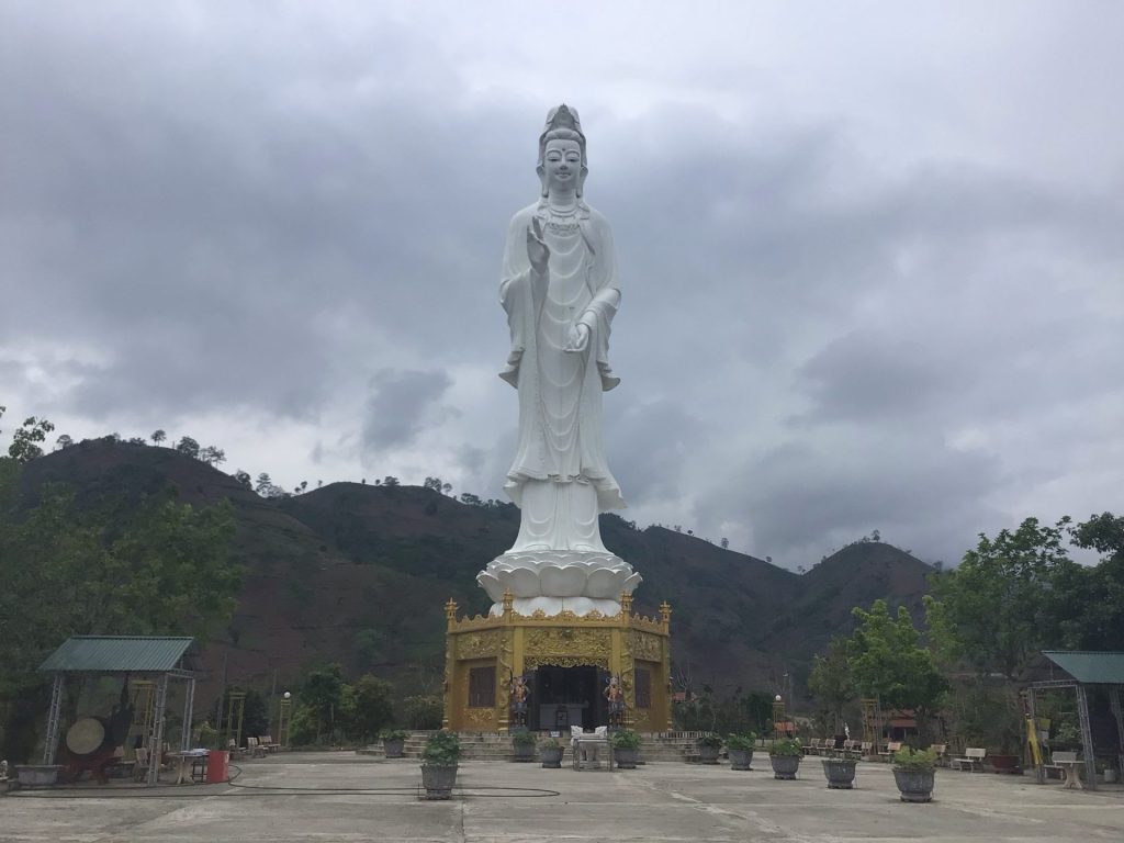 Je dois avouer que je n’ai pas mangé tout le riz. J’en ai gardé pour ce soir. Il me faut repartir. Les muscles ont refroidi. J’ai bien du mal à remettre la machine en route pour le peu de kms qu’il me reste à parcourir. D’autant plus qu’une statue perchée en haut d’un promontoire m’invite à une petite balade digestive.