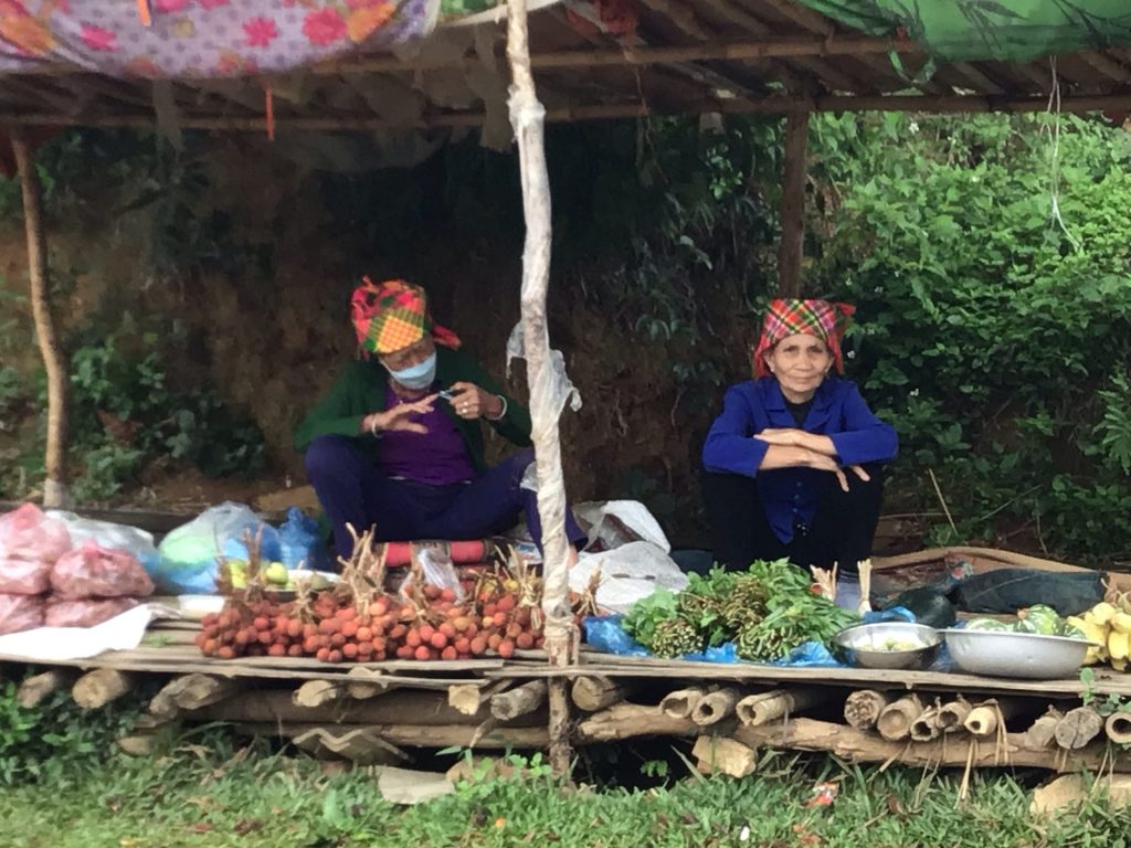 Alors que je viens de quitter la ville, des marchandes ambulantes attendent le chaland le long de la route. Elles vendent leurs produits. La femme sur la gauche est trop occupée à se couper les ongles pour me regarder malgré mes « Hello ! ». Par contre, sa voisine pose parfaitement avec sa belle coiffe colorée, typique de cette région.