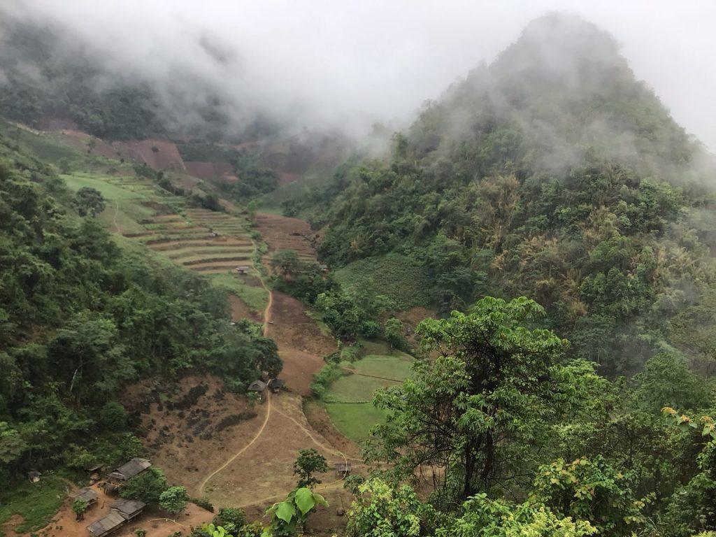 En effet, je retrouve des routes au profil de ces derniers jours : des enchaînements de petites descentes et de gros raidards. Alors que je roule sur une partie relativement plate, j’aperçois des points blancs sur ma gauche. « Mais qu’est-ce donc ? » m’interro-je. Je m’arrête. Ce sont des paysan.nes qui ont grimpé par une sente sur la gauche et qui font des plantations sur le flanc d’un mont hyper pentu. Hallucinant !