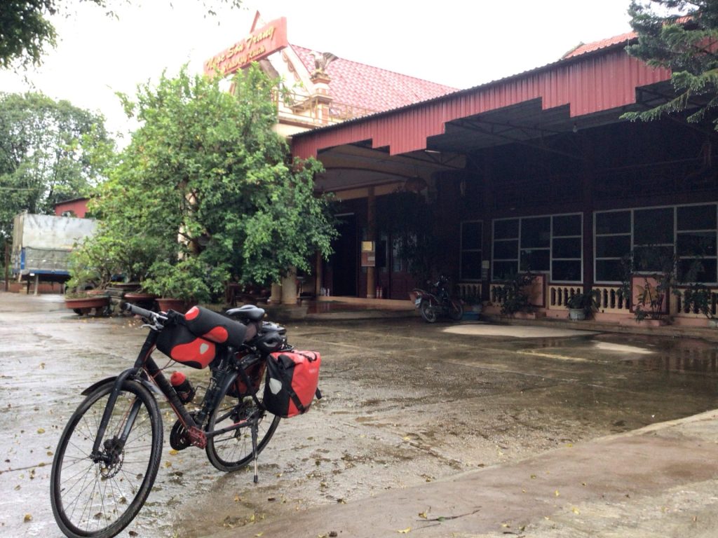 Je compte les bornes. La route est relativement plate. J’envoie du lourd. Vers 14h30, j’entre en ville. Je sors le radar pour détecter un Nhá Nghi. J’en trouve un presque à la sortie de la ville. Des gamins m’accompagnent à vélo. L’un d’eux est le fils de la proprio. Vu l’heure, je lui laisse la charge d’aller réveiller sa mère. La chambre est correcte et au tarif conventionnel de 200.00VND. Je me pose enfin.