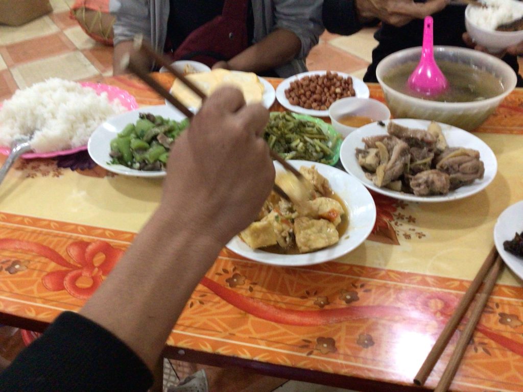Je résiste au sommeil en espérant une pause diner. Heureusement que j’avais acheté des barres à base de cacahuètes au poste frontière. Cela permet de me caler un peu. Vers 21h30, mes vœux sont exaucés. Le bus s’arrête en rase campagne devant un grand restaurant accueillant les bus en transit. Je suis la marée et m’installe à une table. Je dénote légèrement en tant que seul occidental et, en plus, avec ma tenue de cycliste BMC bien voyante. J’ai l’impression d’être un chien dans un jeu de quilles. Une serveuse nous apporte tout un tas de plats pour notre tablée de 4 personnes. Je goûte à tout en mangeant avec mes baguettes ce qui amuse beaucoup mes condisciples. Par contre, pour les cacahuètes, ce n’est pas évident !