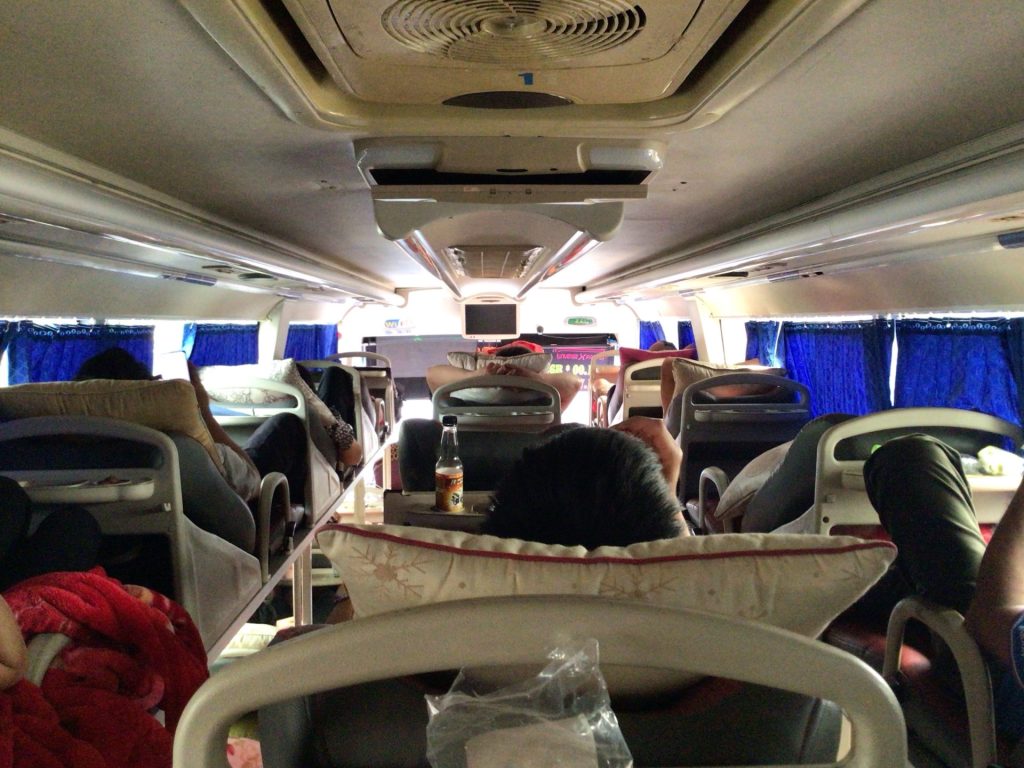 J’ai juste le temps de charger Haka2 en soute, d’aller boire un Nuóc Mia bien frais, de m’acheter une bouteille d’eau fraiche et d’embarquer. A 15h00, le bus décolle. Celui-ci est bien rempli. Il ne reste que quelques couchettes de libre. Je me retrouve à nouveau en haut comme hier et comme dans les auberges de jeunesse. Mais cette fois-ci je suis dans la rangée du milieu, je ne pourrais pas profiter pleinement du paysage. J’espère que, demain, j’en profiterais à fond au … Laos ! « Tout se fera ! ». Positive attitude.