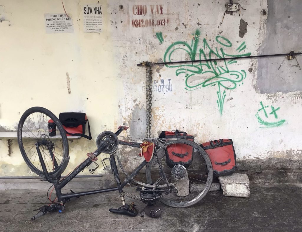Je profite de cet arrêt au stand pour nettoyer mon Haka2 qui a pris cher sous l’orage du côté de la carrière hier aprèm. Effectivement, j’ai un beau clou qui a percé mon pneu arrière. Bienvenue en ville … Une fois nettoyé et déclouté, je repars vers le Département de l’Immigration. J’y arrive vers 7h30. Il y a déjà la queue avec beaucoup de vietnamiens et quelques occidentaux. Selon les indications du vigile, je stationne mon vélo au milieu des scooters dans un espace réduit. Evidemment, je trouve le moyen de me frotter contre un pot d’échappement et de me brûler le mollet. Ça continue les emmerdes …